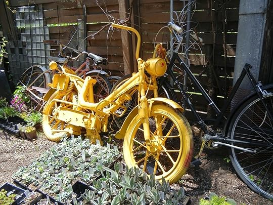 This antique bike is outside of a shop called Evolutions in Design. I posted pictures from there once before. I love how the yellow bike sticks out amongst the rusty and dusty objects and little potted plants.