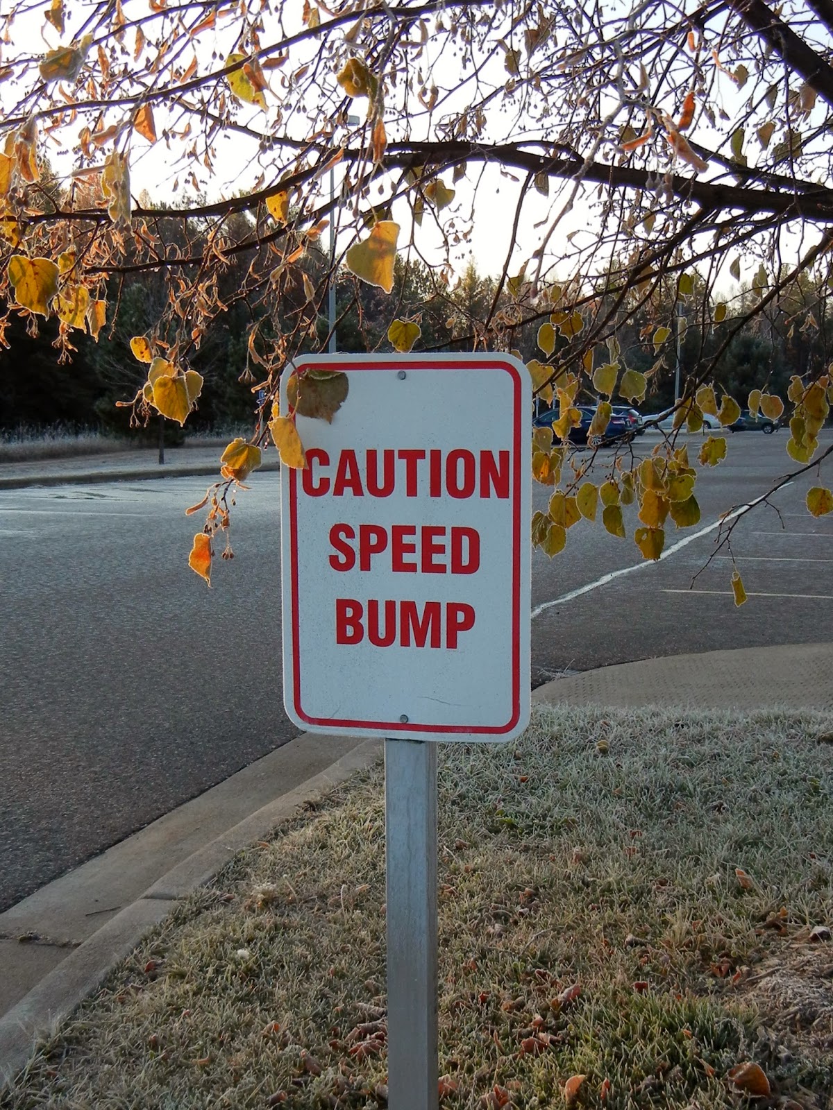 The first sign was totally fine, but for some reason they replaced it with this one. And one other thing to note: there is no speed bump. They took it out one winter so they could plow snow and they never put it back in the spring. Maybe they figure that if they keep putting up new speed bump signs people will slow down just reading them.