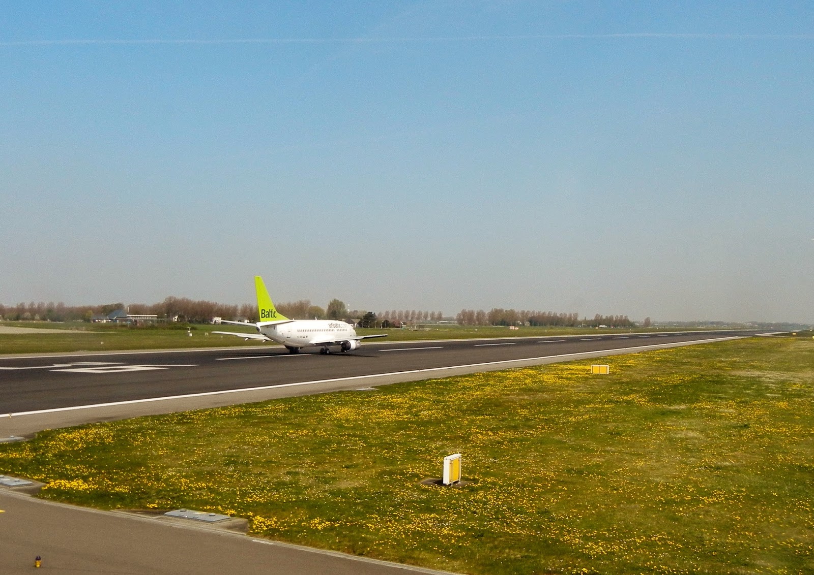 A plane taking off at the Amsterdam airport.