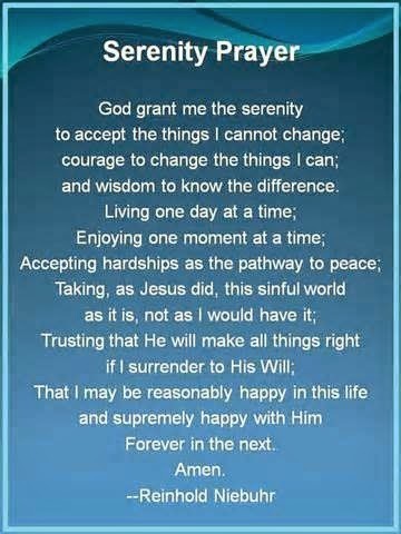 I probably get that from the Serenity Prayer. I guess it is so engrained in me from those few years I went to Al-Anon. But no matter what your circumstances, that prayer should guide everyone in any struggles that they face. Serenity. Peace. Patience. Trust. Faith. Acceptance.
