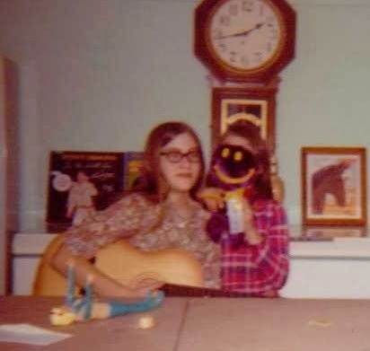 Sorry the photo is so grainy. It's from 1972. I thought I had a better photo of my sister with her guitar, but this will have to do. I have in my house right this minute three, possibly four of the items in this picture. Can you say "pack rat"? Bonus points if you can tell me who is on that album cover on the left. Super extra bonus points if you can tell me what is wrong in this picture besides the obvious (which is where is my face?). You probably would have had to know my sister to answer the super extra bonus question.