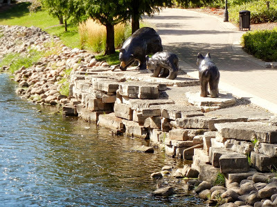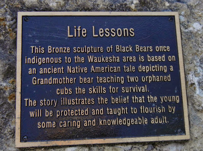 Downtown Waukesha, there is a river walk with some interesting features. Can you read the sign about the granma bear? What a great story, huh?