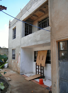 The window of this room overlooks this fine yard belonging to the neighbors, where roosters live and crow each morning by four AM. (Picture taken from the roof.)
