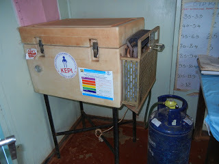 The refrigerator at the clinic. With no electricity, it is run on a gas coolant.