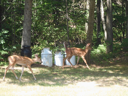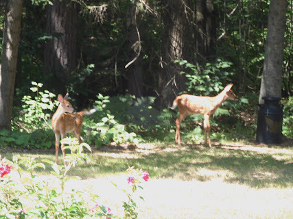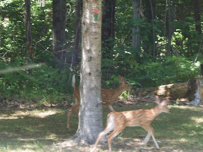 Friday, I saw the doe coming out of our woods and couldsee movement behind her. I ran to grab my camera, and when I got back to thewindow, she had moved on. But there on the edge of the woods, where she hadjust been, was not one, but two adorable fawns.