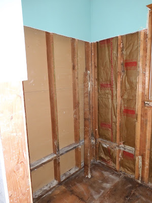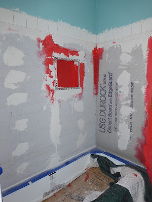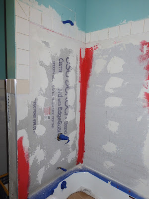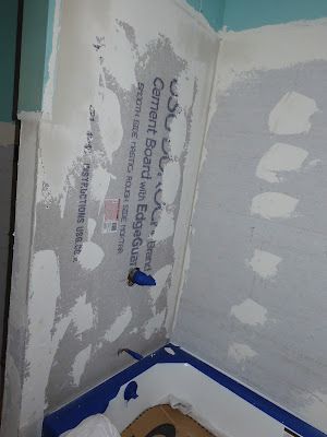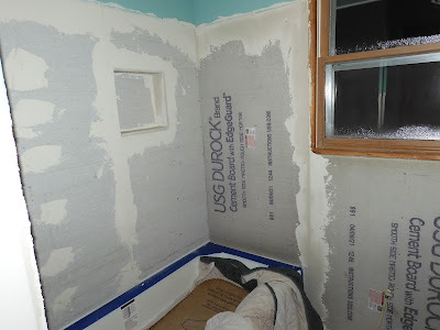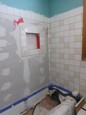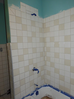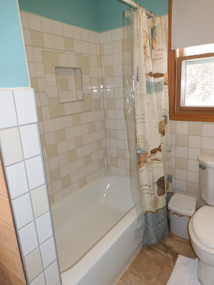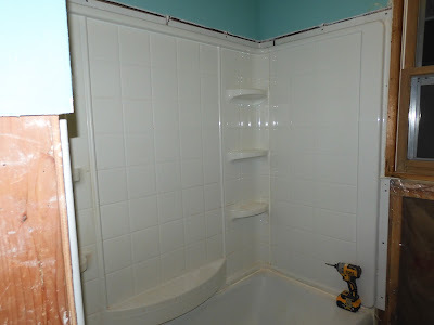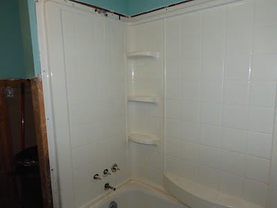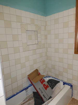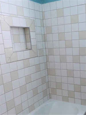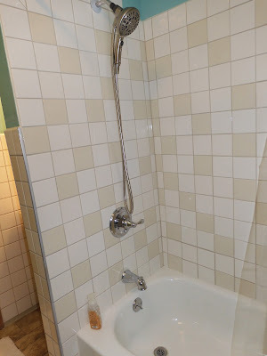 So here are the before, during, and after pics of our shower. Many years ago, we had installed one of those tub surrounds, which we had thought about keeping. But then my daughter offered us boxes and boxes of tile which came with the house she bought a few years ago.