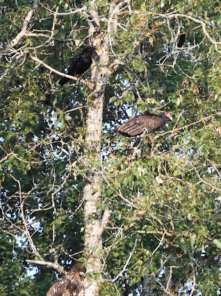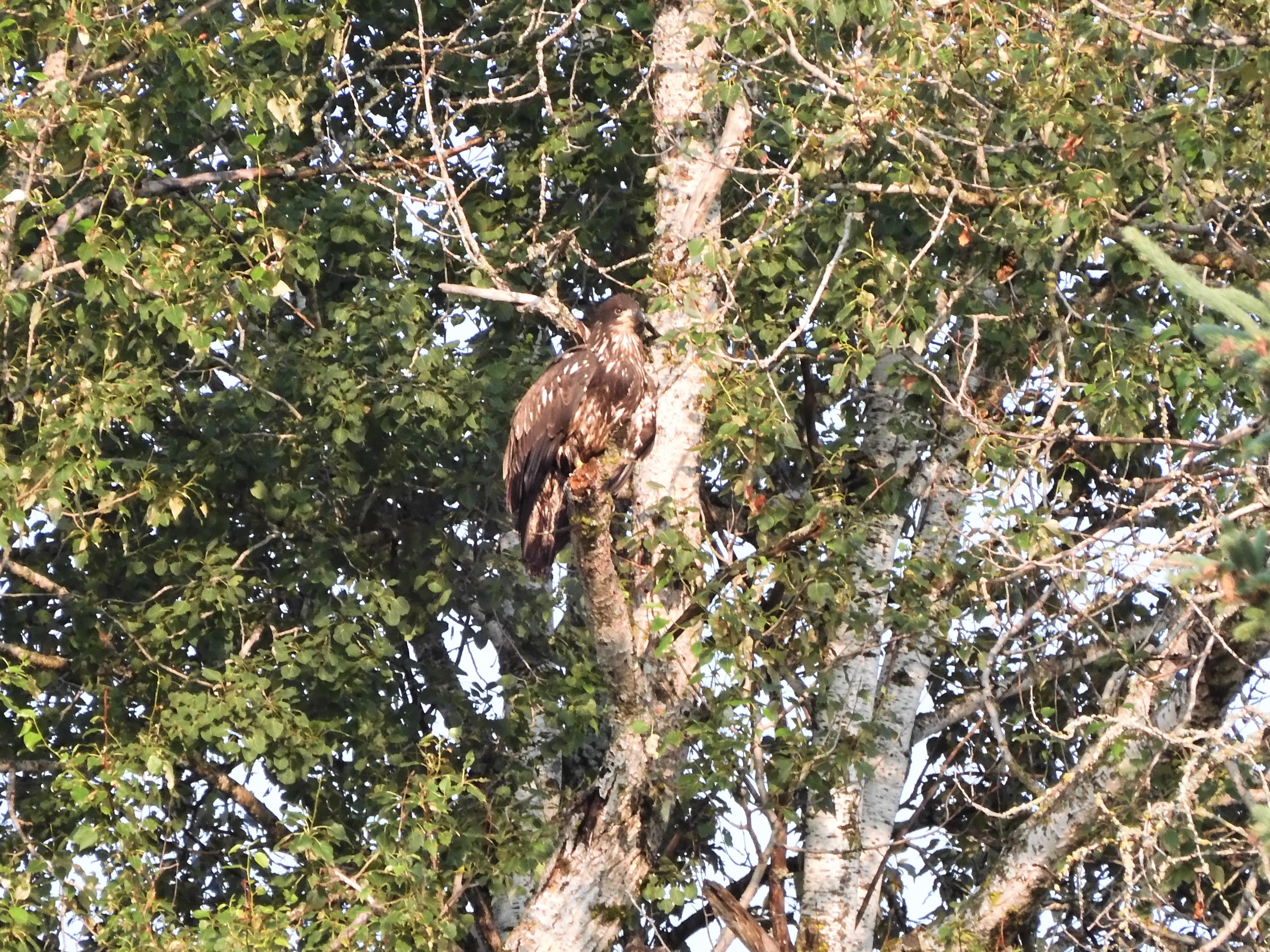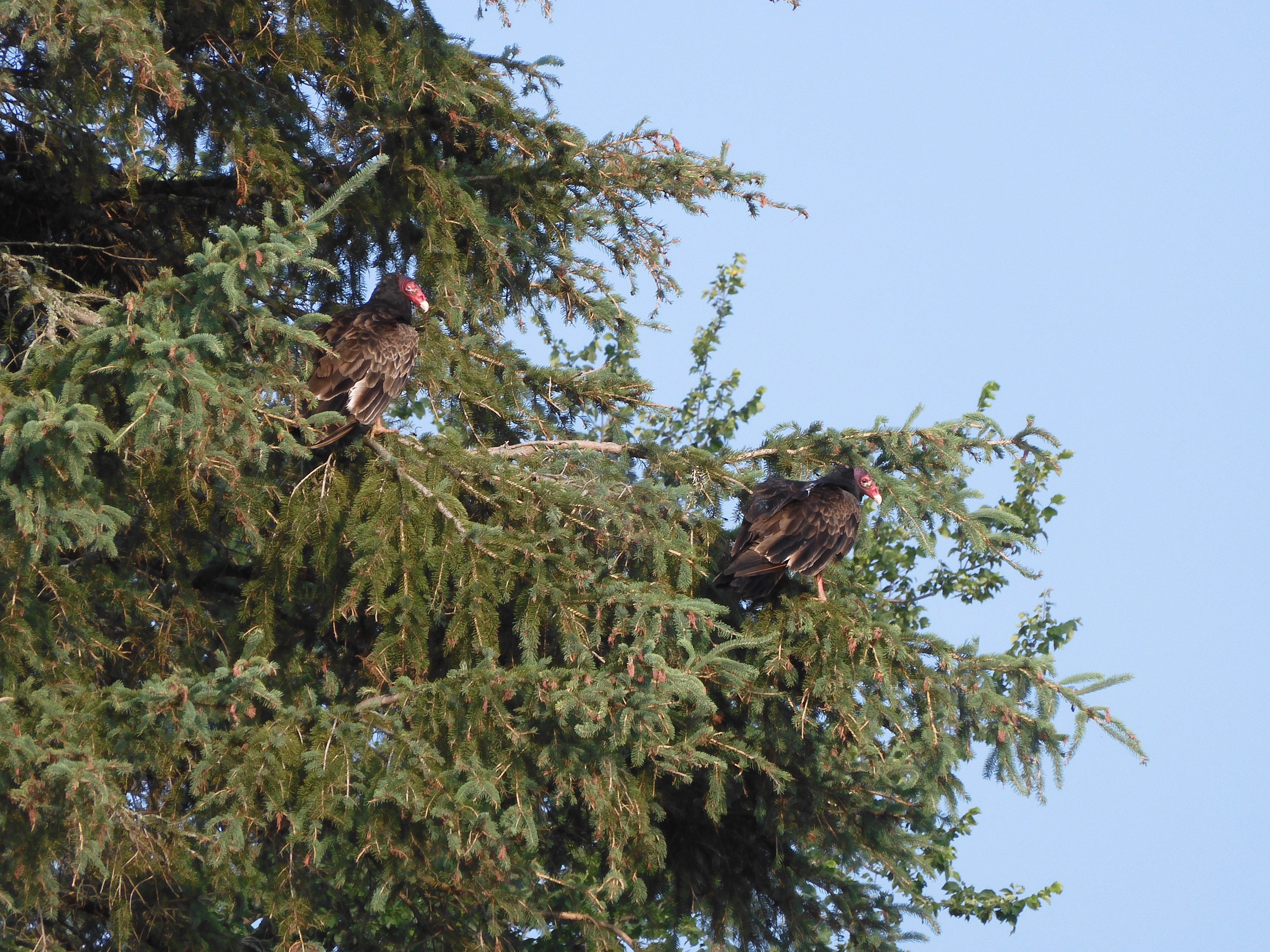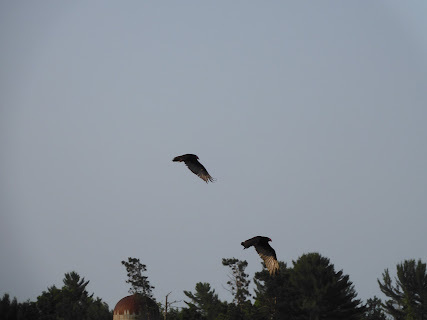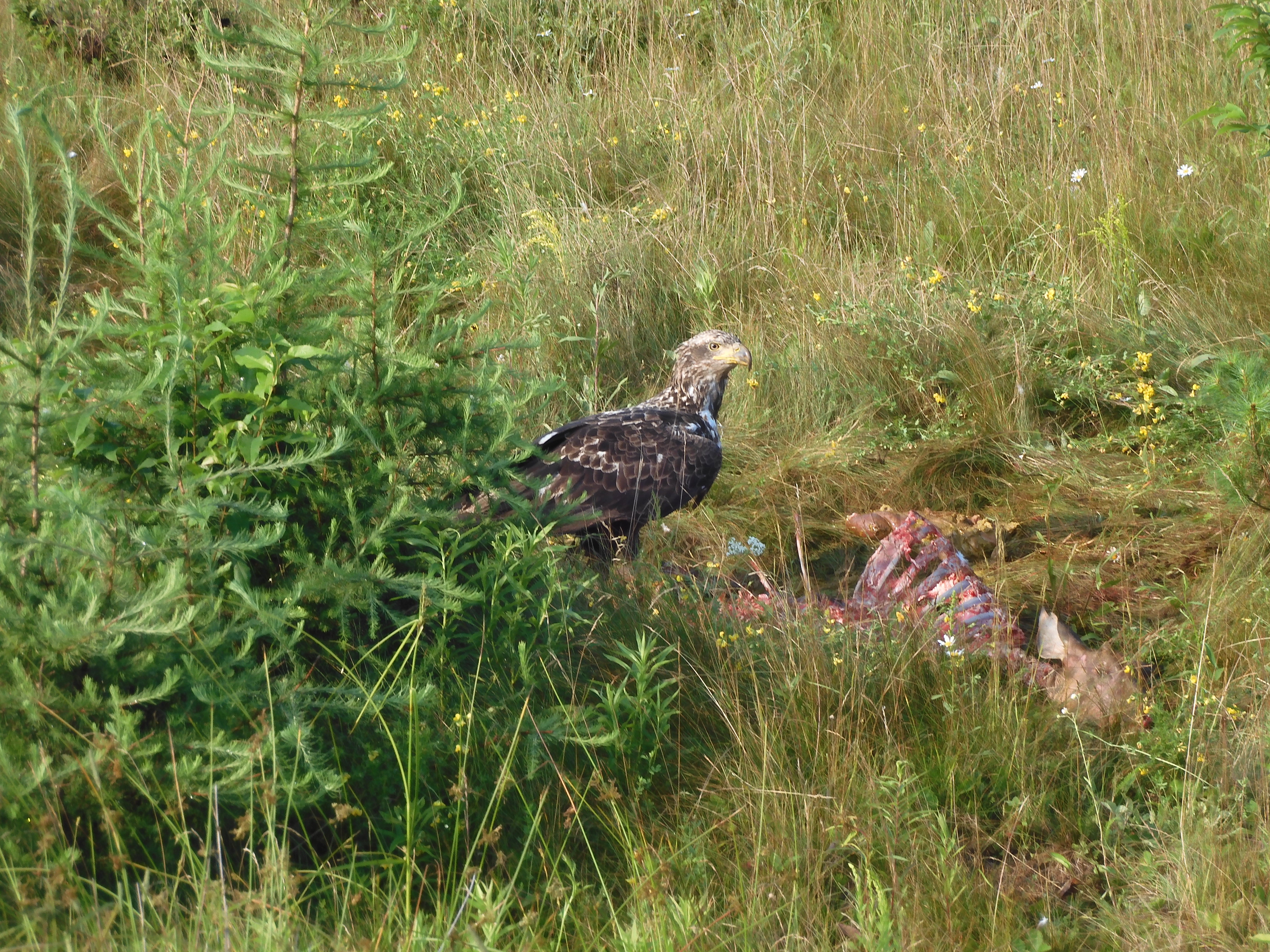 There we were the morning of July 15 – appropriately, as that is my sister Pat’s birthday – driving up to Lake Superior. We came upon a bald eagle in a pine tree holding court over either an immature bald or golden eagle eating a deer carcass, while turkey vultures and ravens hovered overhead or watched from nearby trees. And even ordinary old crows were waiting their turn across the road.