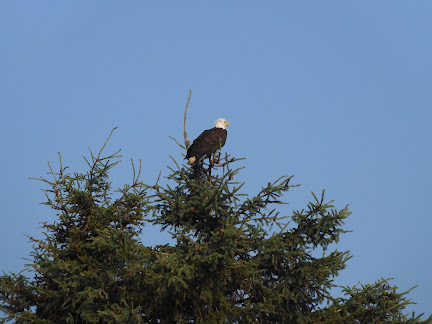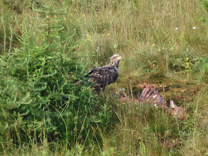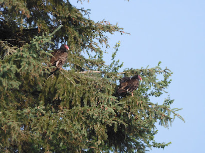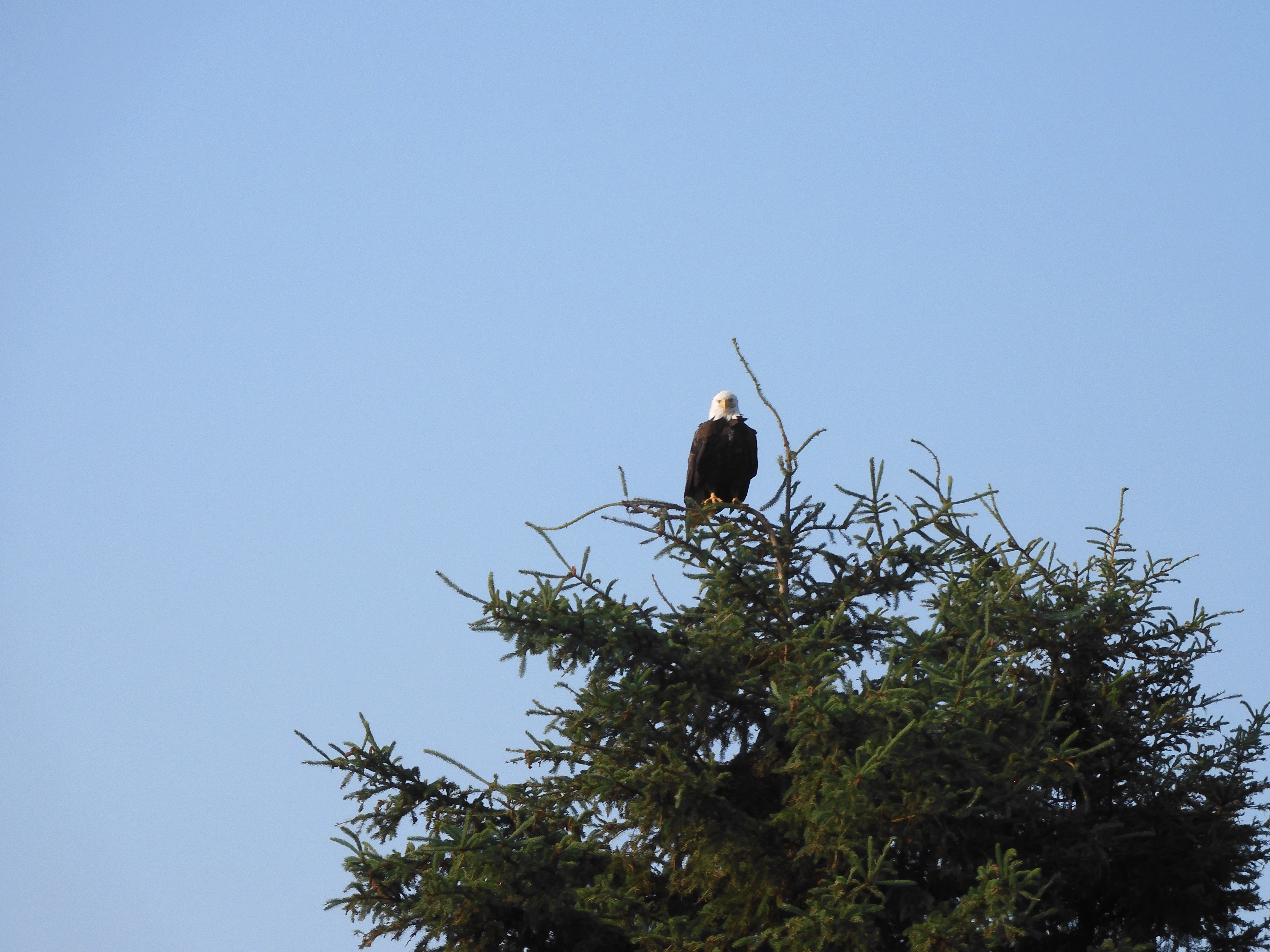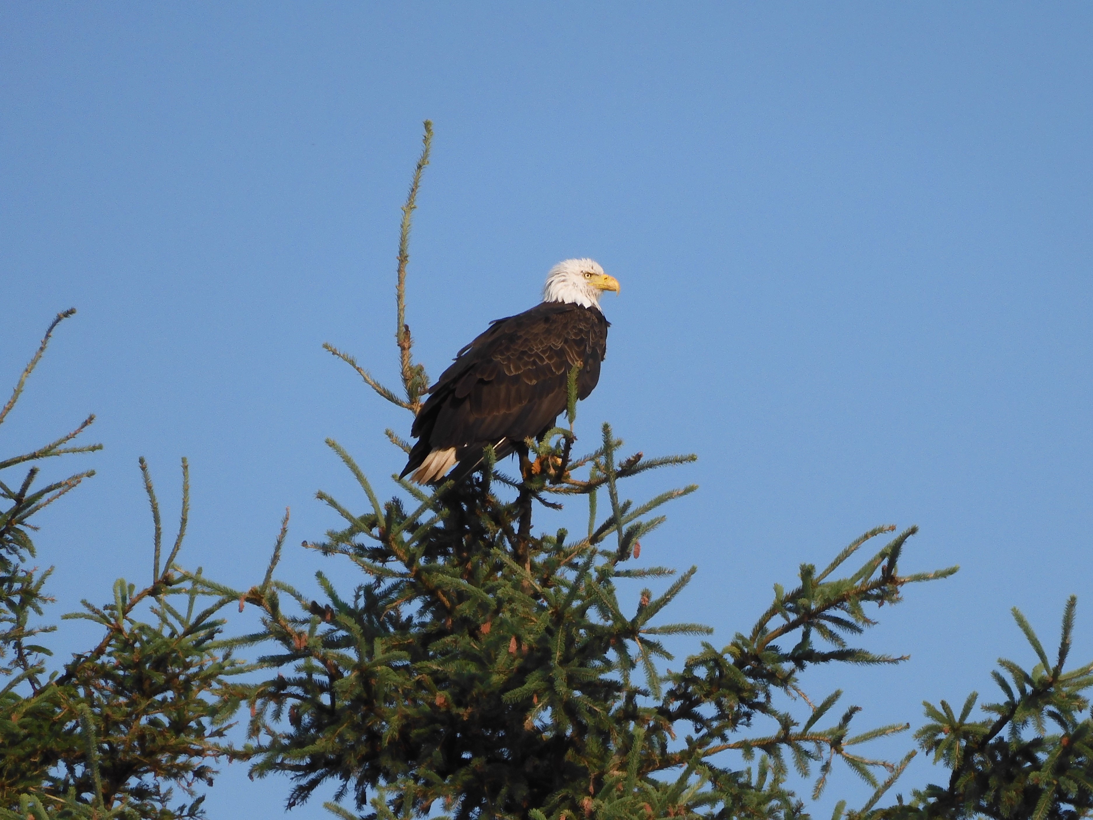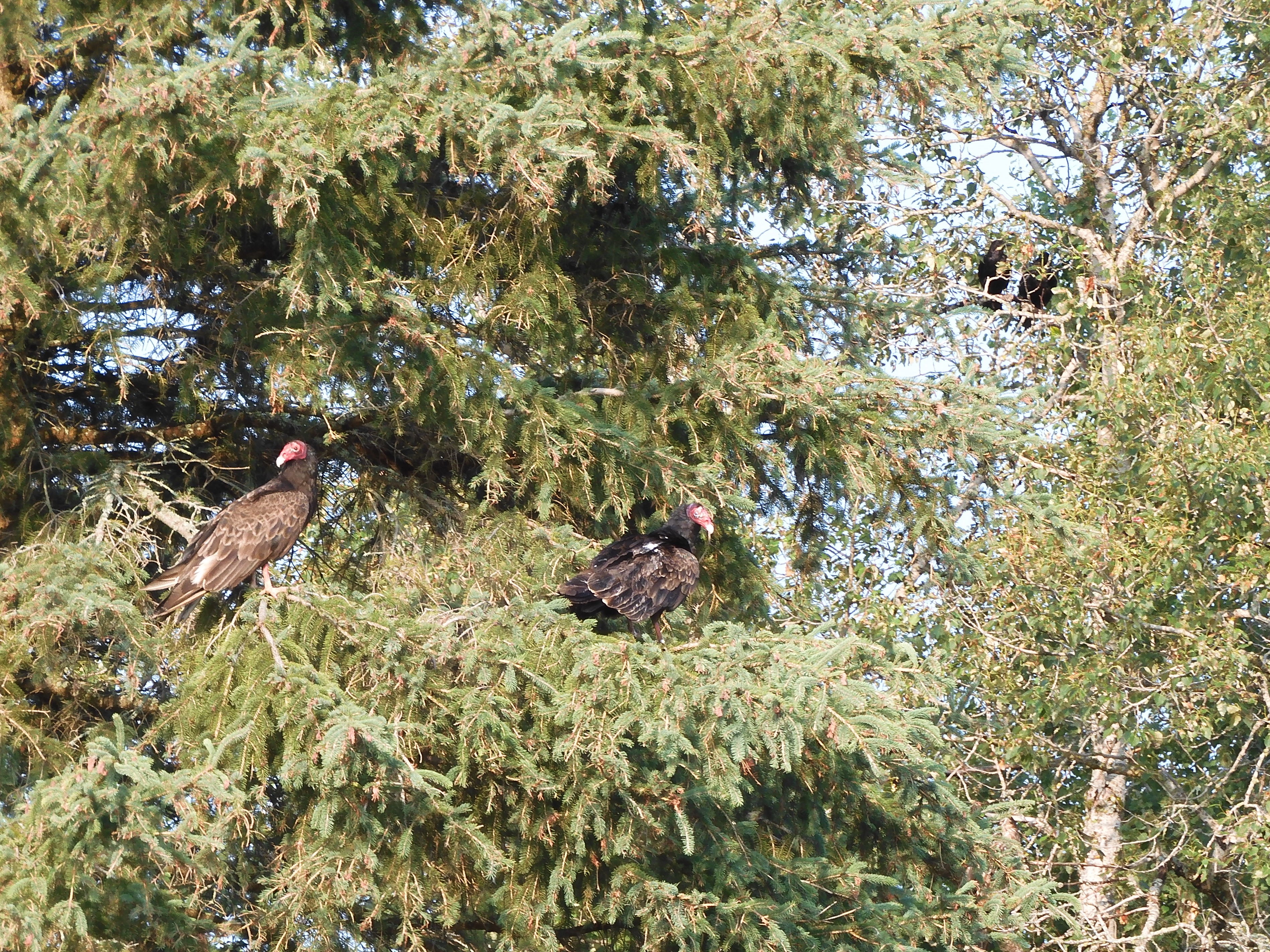 There we were the morning of July 15 – appropriately, as that is my sister Pat’s birthday – driving up to Lake Superior. We came upon a bald eagle in a pine tree holding court over either an immature bald or golden eagle eating a deer carcass, while turkey vultures and ravens hovered overhead or watched from nearby trees. And even ordinary old crows were waiting their turn across the road.