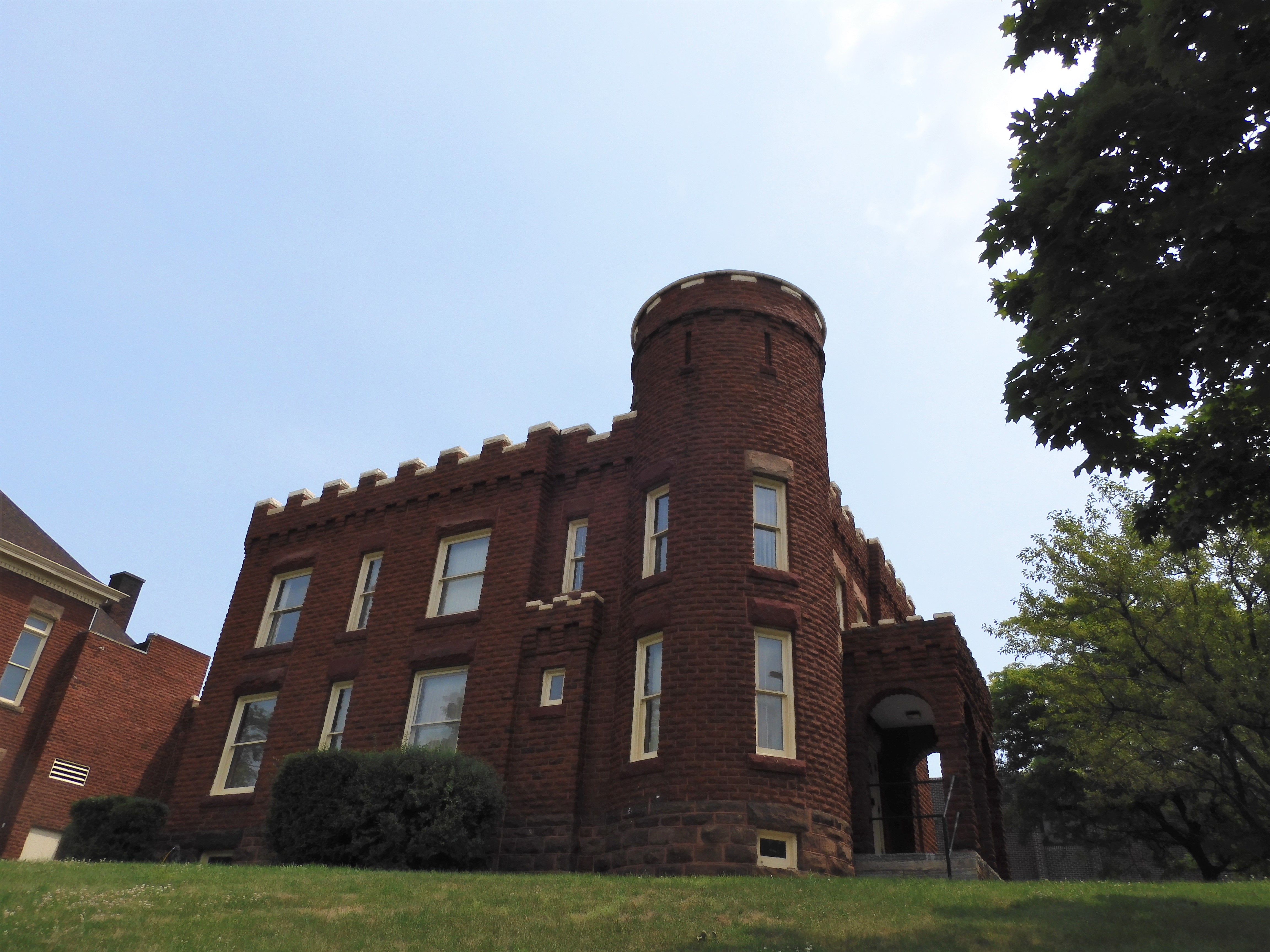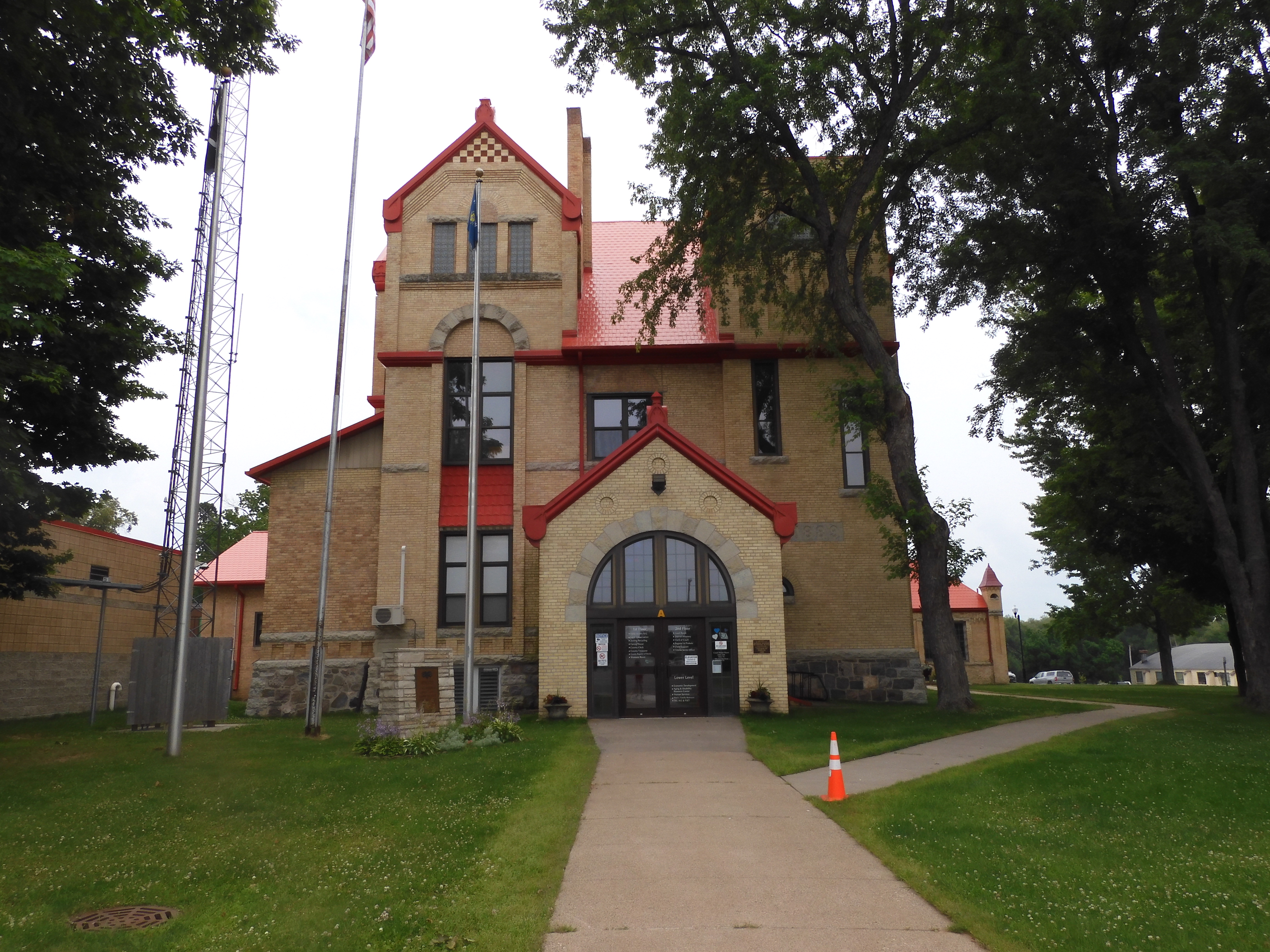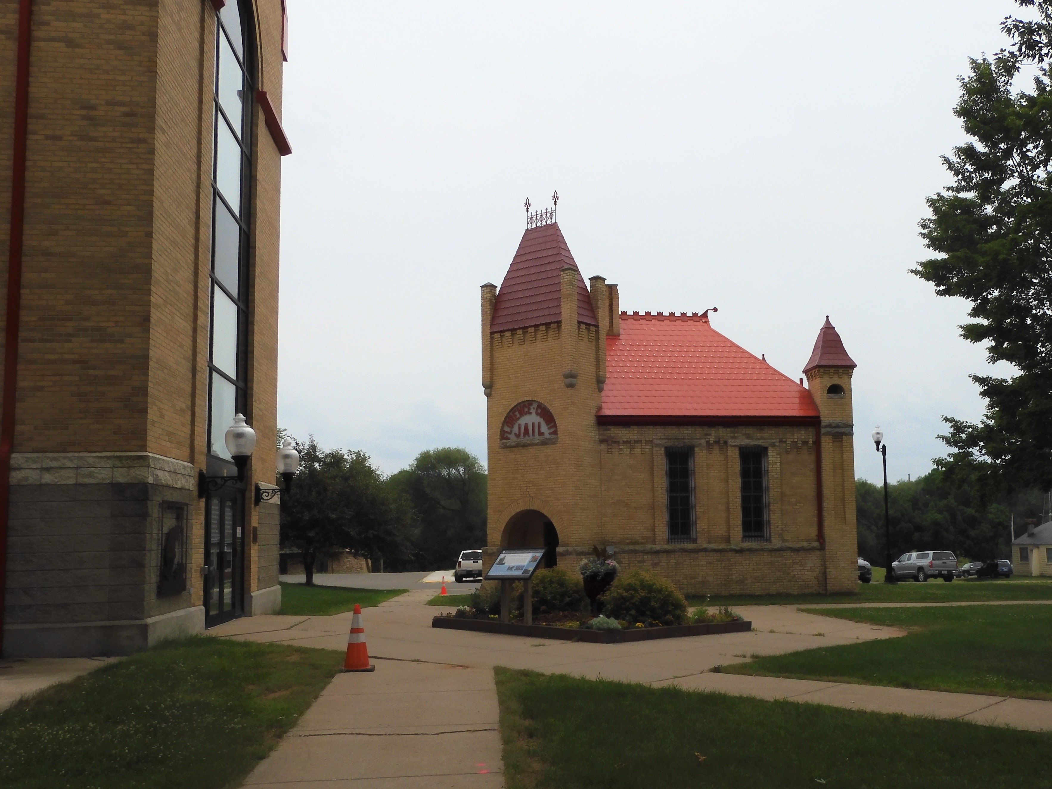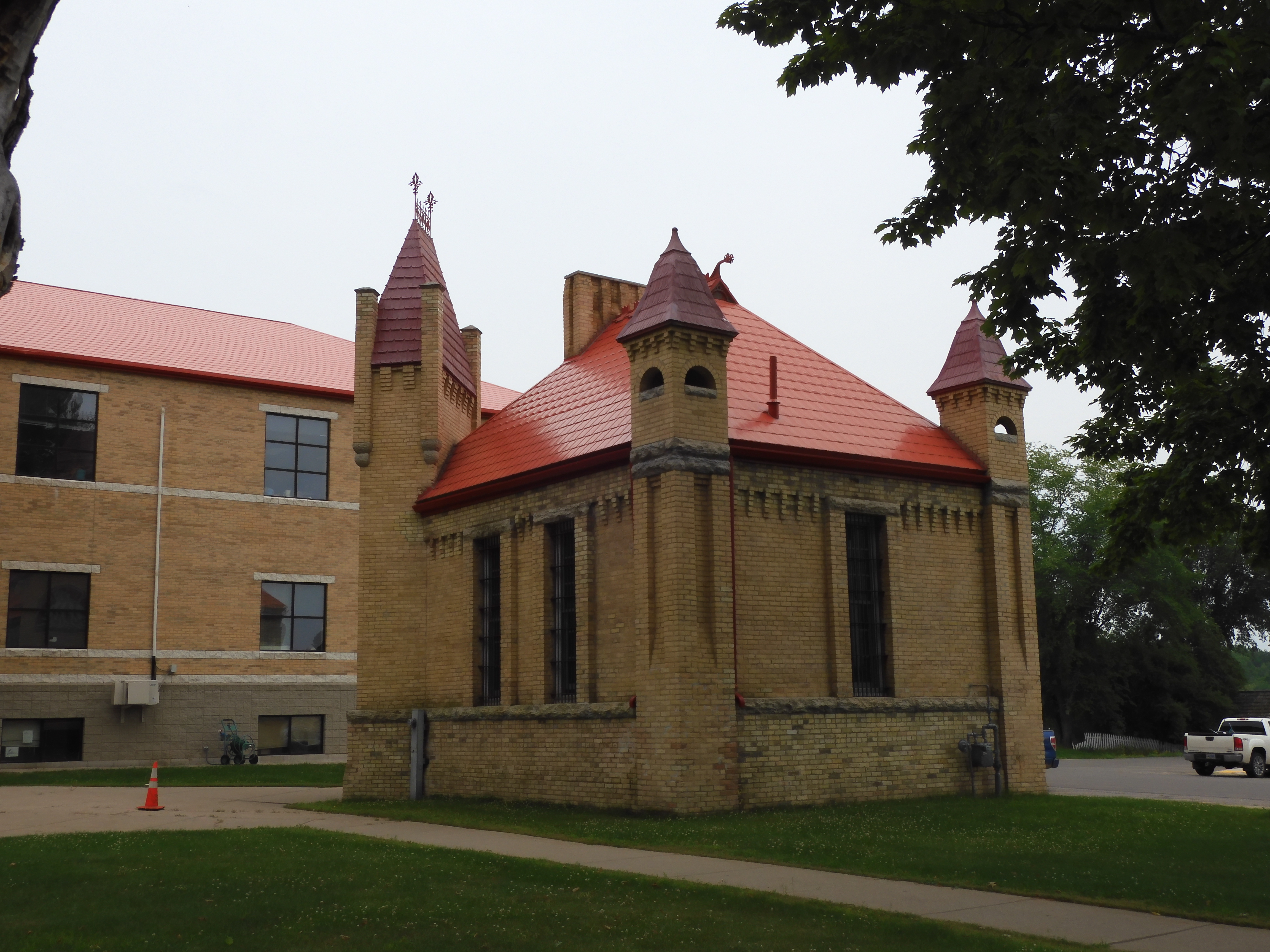 According to several signs on the property: James E Clancy, architect for the courthouse, also drew up the plans for a small jail. Built in 1889 for a cost of $4,000, it featured two steel cells for men and an iron cell for women. The county stopped using the jail in the 1930s. After years of disuse, an exterior renovation was completed, in 2006. It is one of only two remaining examples of this type of jail in Wisconsin.
