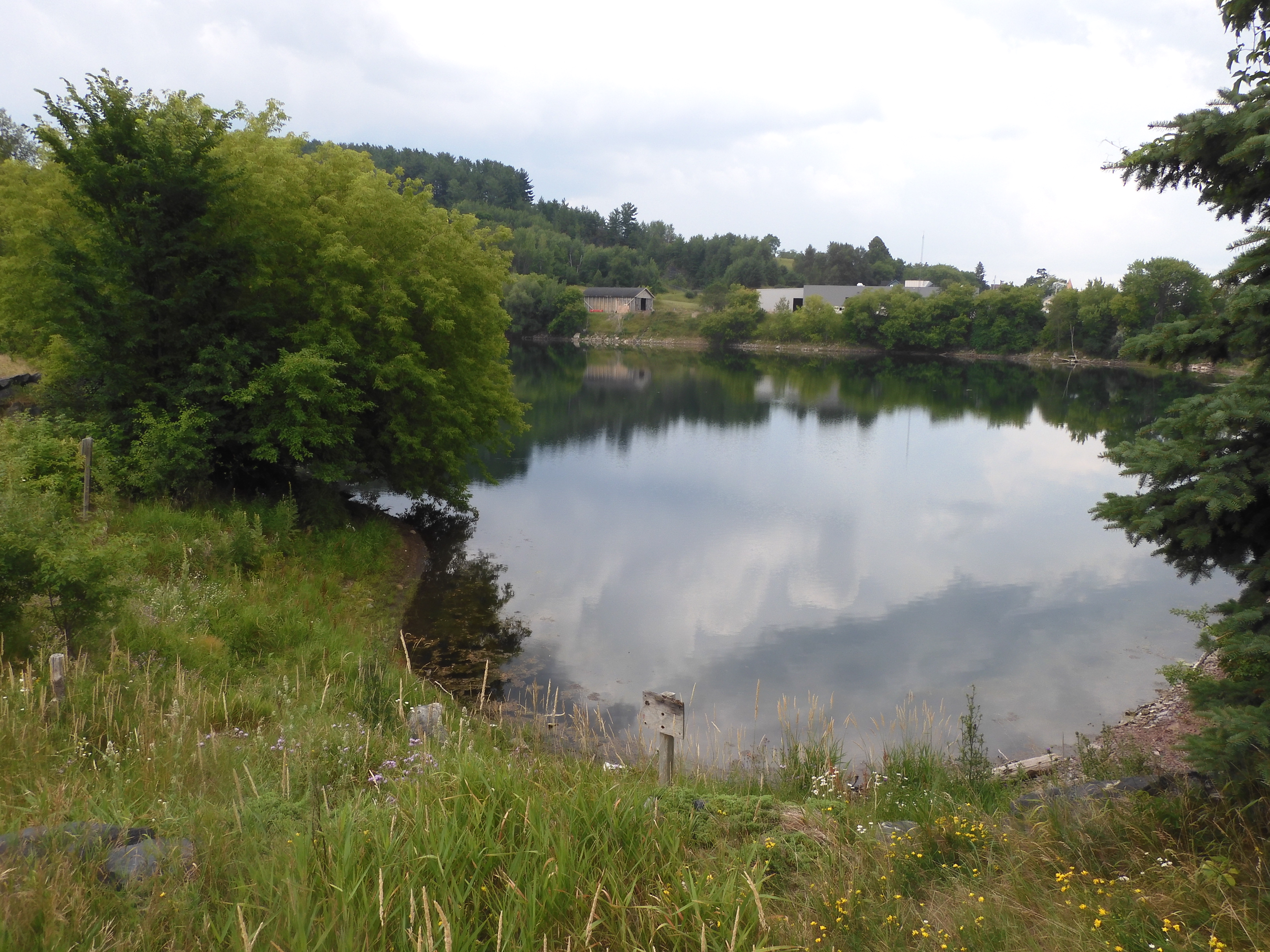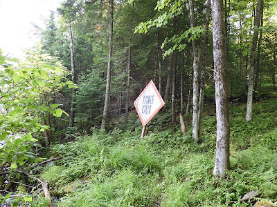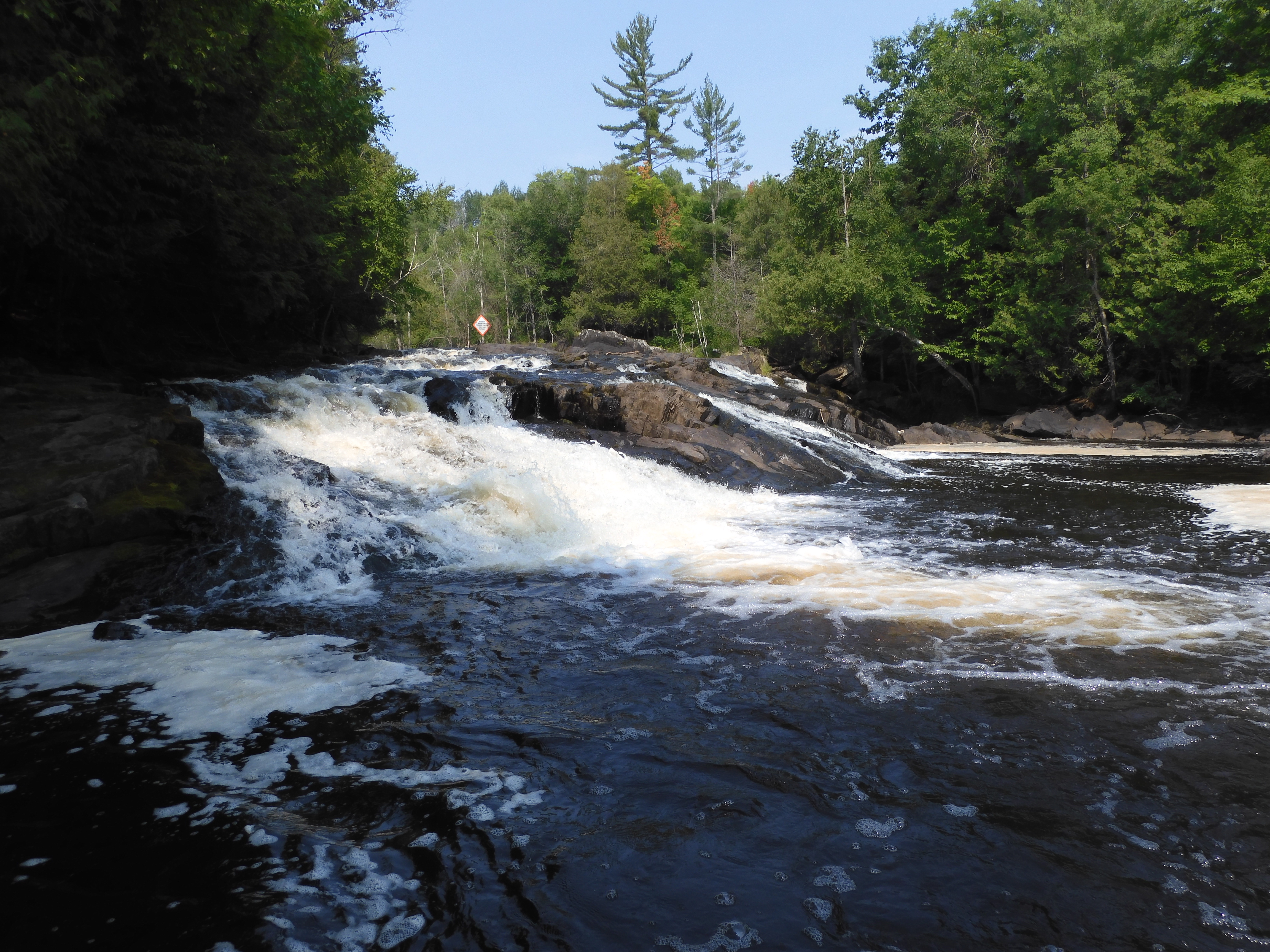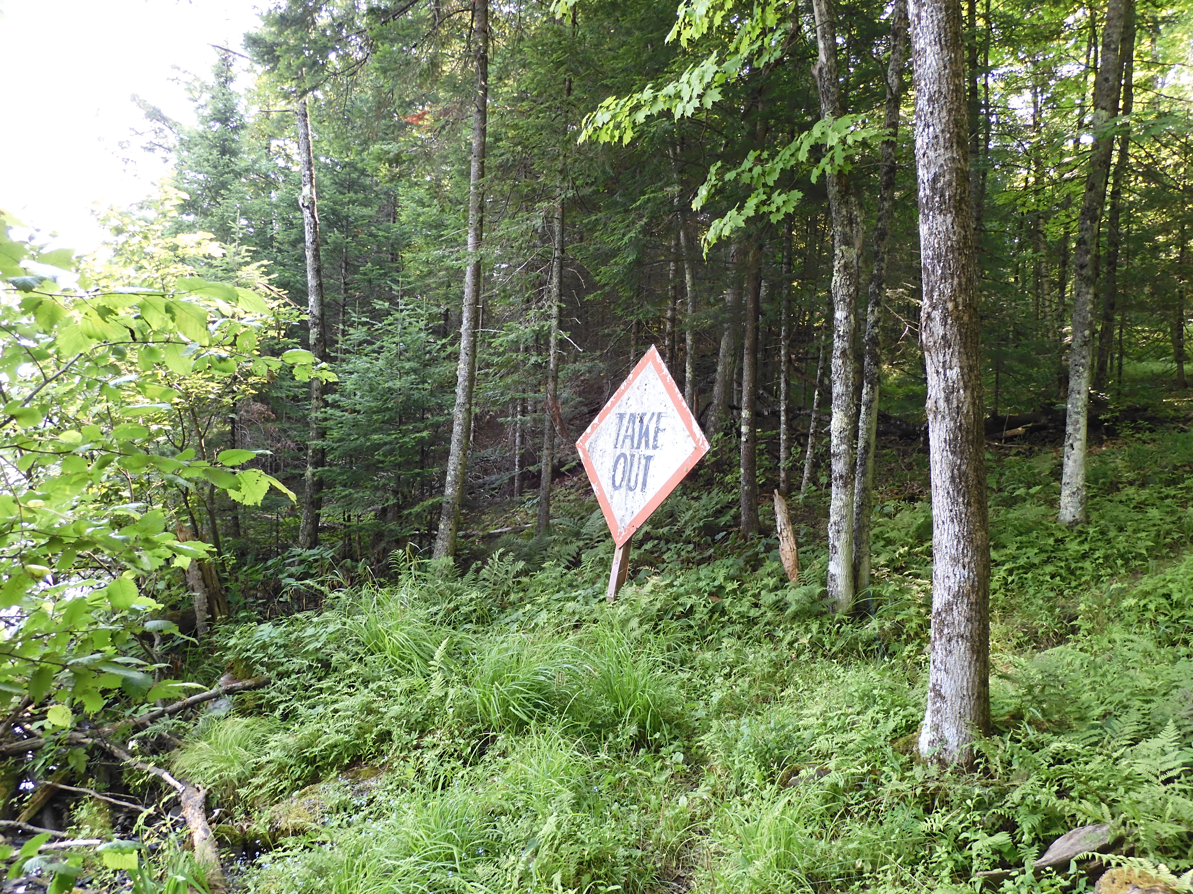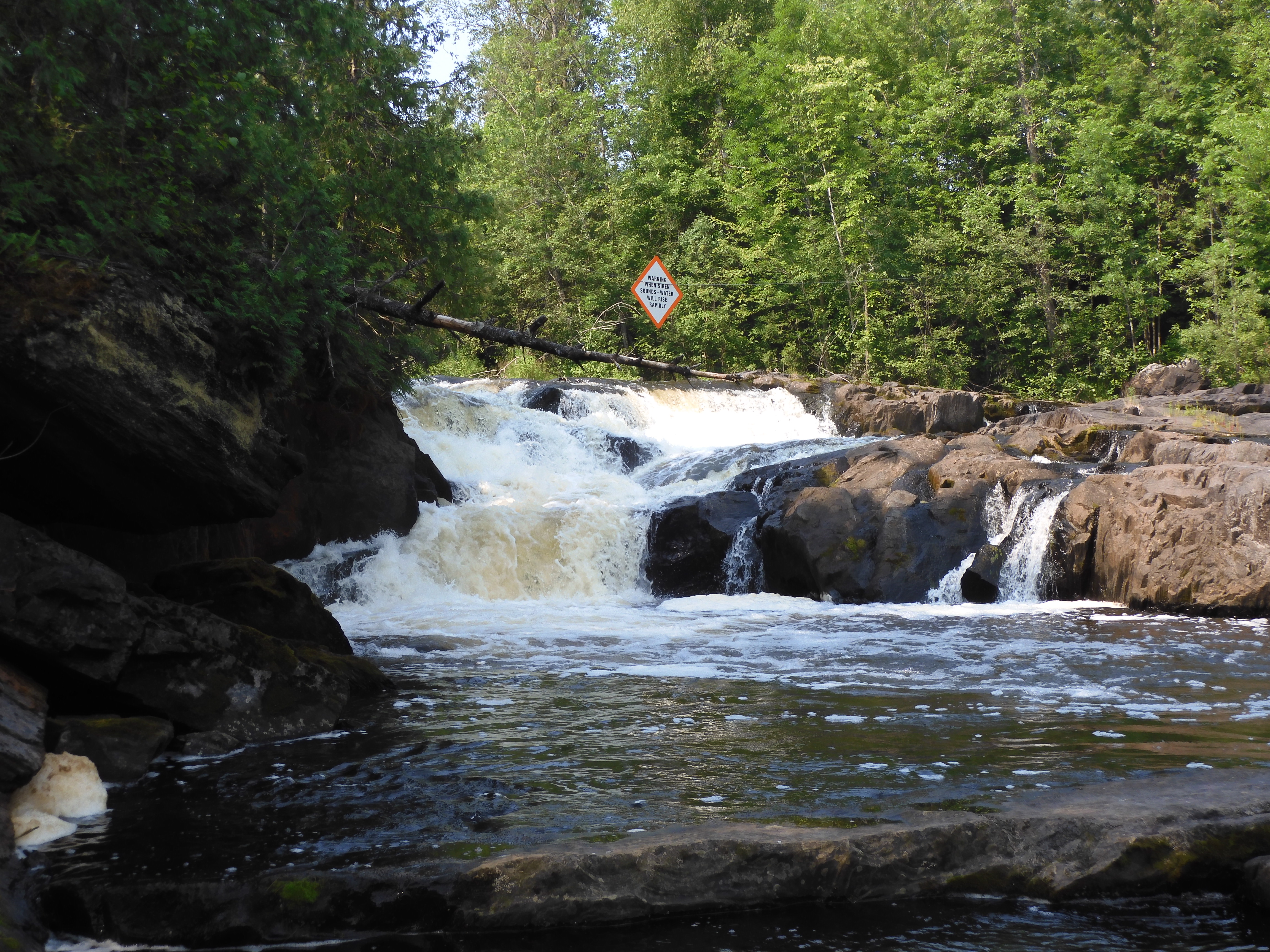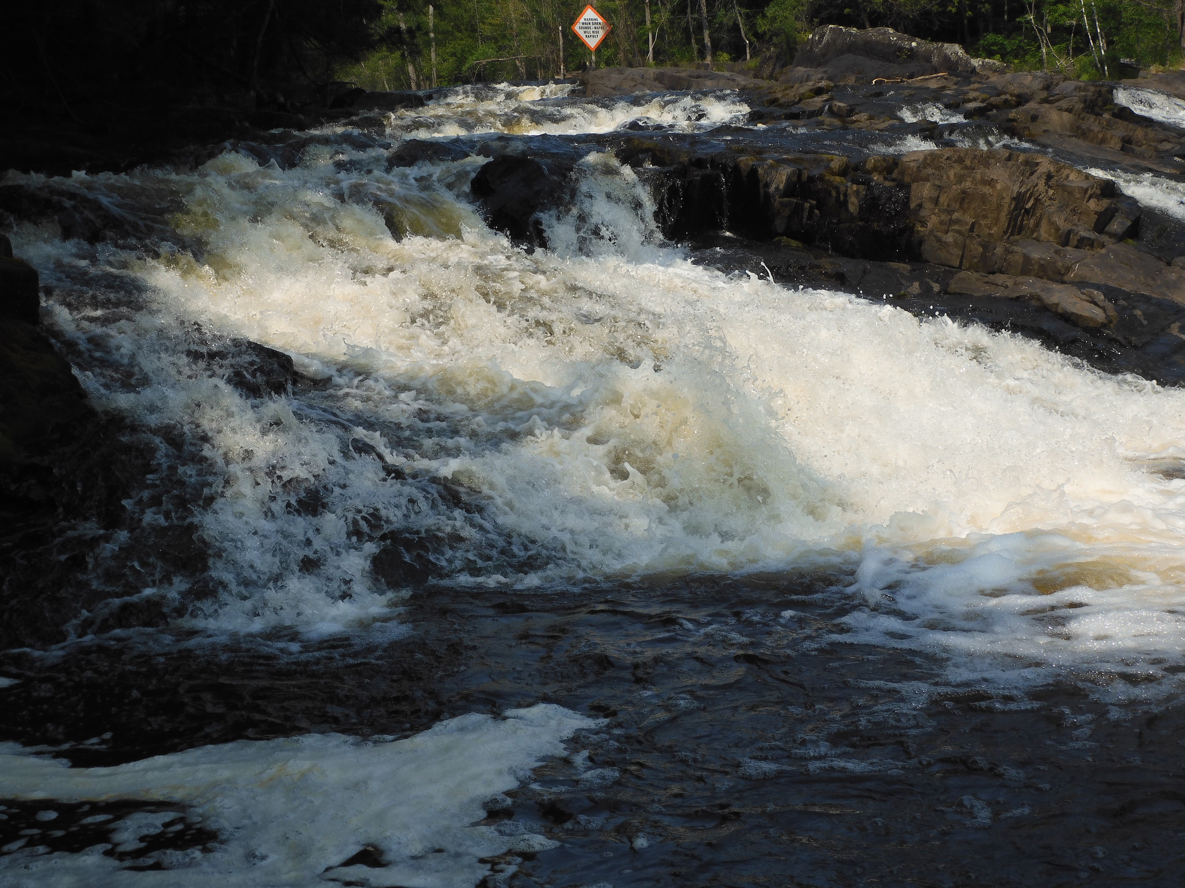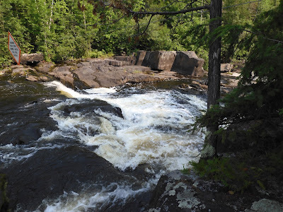 I went back up to the powerhouse and followed the canoe portage signs in the other direction, up a service road that ran along the river. I couldn’t see the river, only heard it. Signs along the way kept pointing to Breakwater Falls, so I had to be heading in the right direction.