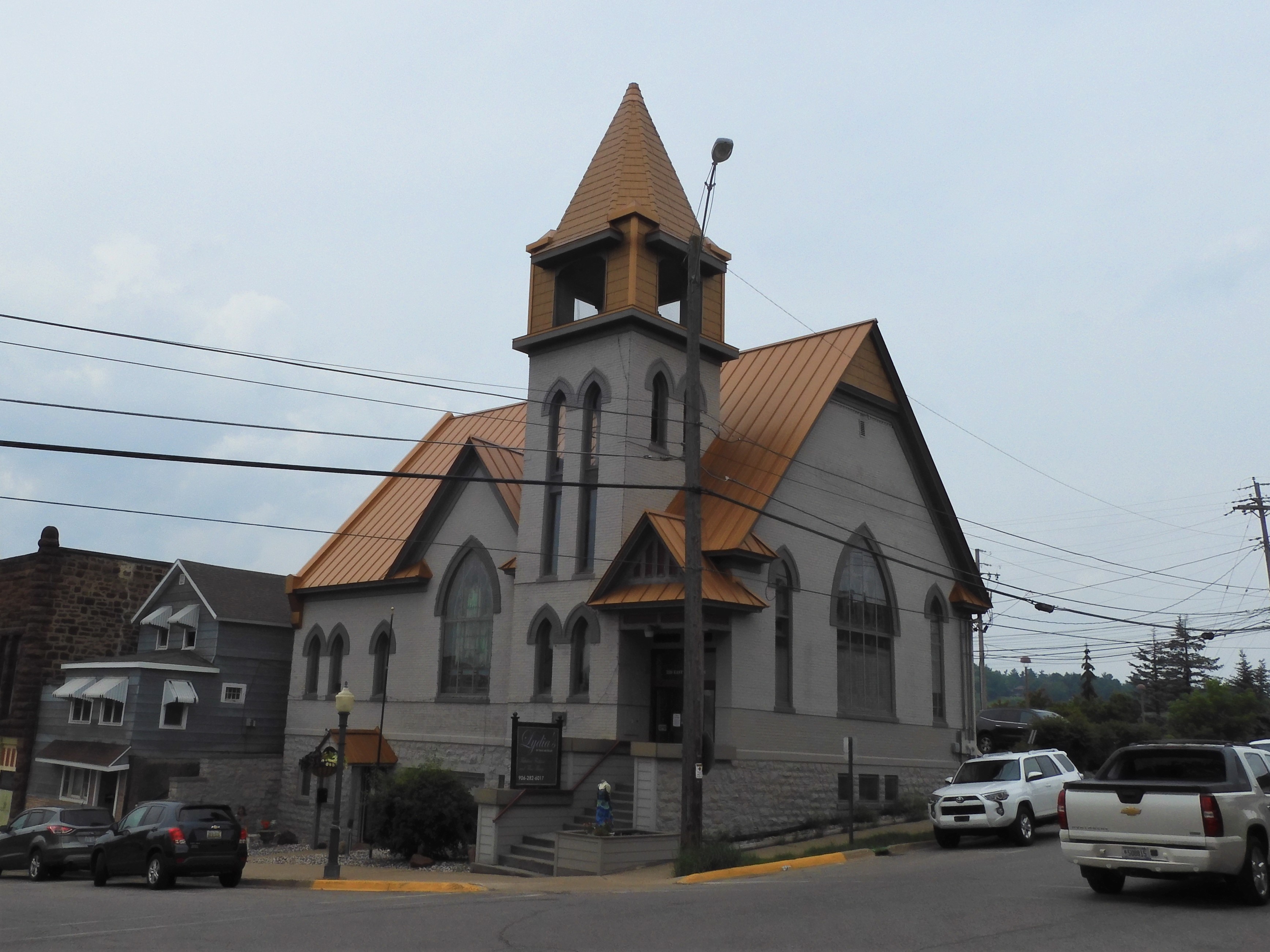 Here’s a detailed description from a real estate listing I found on the place from 2016. A beautiful building to locate your business or church in this completely remodeled 1908 treasure. Was remodeled to house a Morgan Stanley office and local law firm. Complete with original ornate, very valuable stained glass windows protected by thermal panes, vaulted ceilings, beautiful arches, and original woodwork. Newly remodeled offices are partitioned with glass with exposed ceilings. Lower level remodeled as office space and currently rented as a law office. The main level was last rented as a financial center. Notice the newer metal copper tone roof.