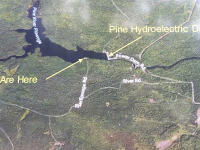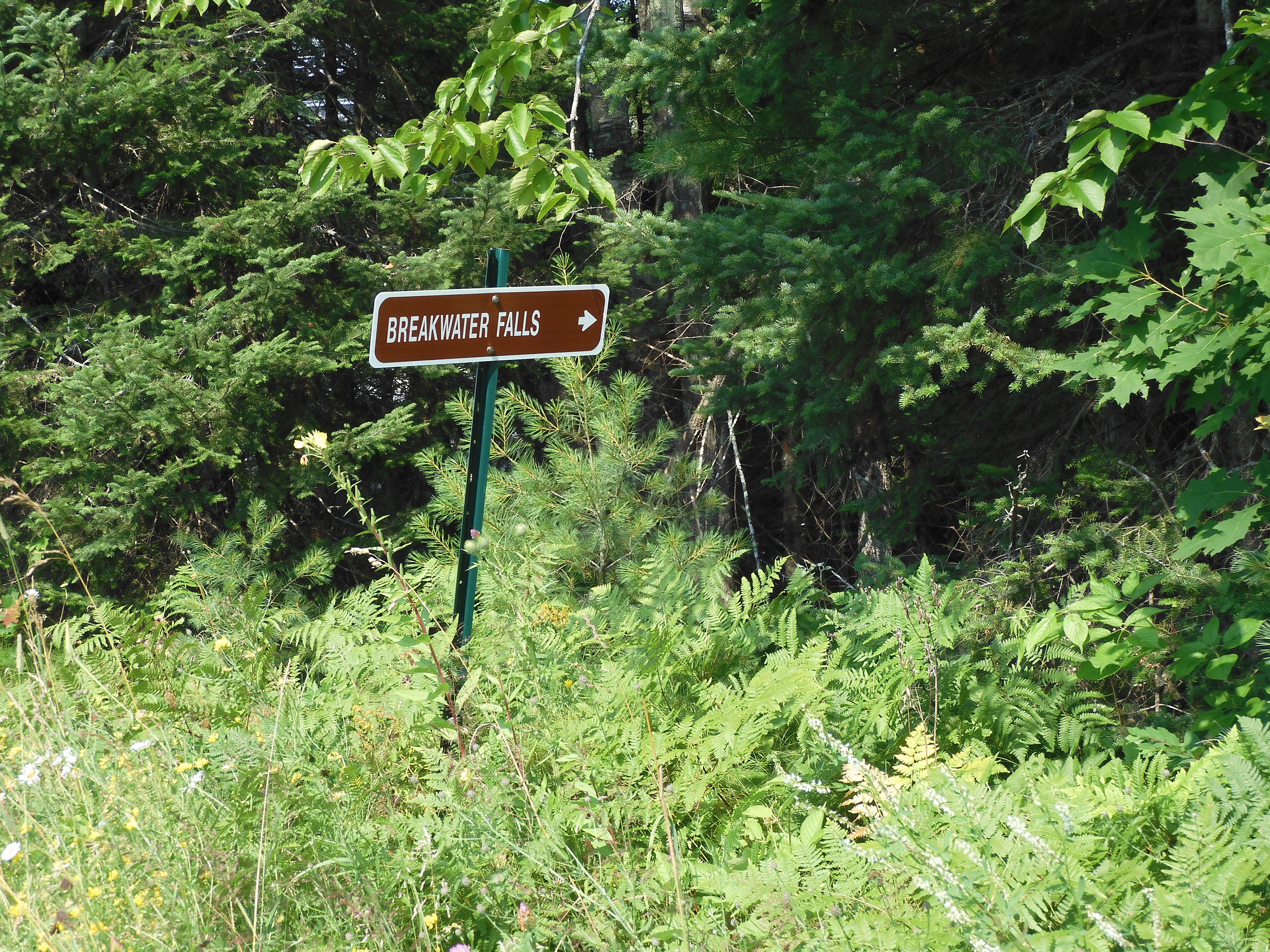 After ten minutes walking along this service road, the dog and I came to a parking area with a Breakwater Falls sign pointing into the woods. Even though the book had said this should be Pine River Falls.