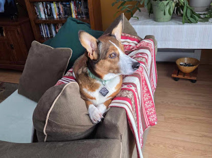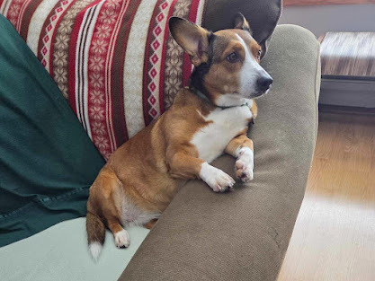 I’m not happy she has taken over this chair, but she is just too cute lying onher perch. I’ve heard some Corgis think they are cats, so this makes sense. Andshe still gets along with our cat Emma fine.