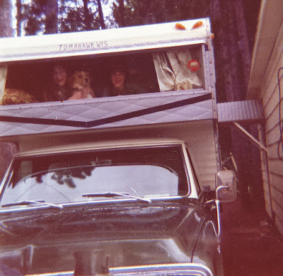 More memories in that camper, with my sister Pat and our dog Mac, with the second pickup truck.