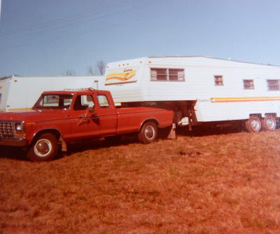 Finally, my dad’s last truck, a big new Ford extended cab which we nicknamed Big Red. Shown here towing dad’s fifth wheel. He bought the trailer a year before the truck, so ordered that color pickup just to match the camper.