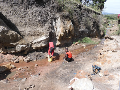 But the women have discovered something. Remember being at the beach as a child and digging in the sand a few feet from shore. Soon the ocean water would come up into your hole. Same principle here, and the water is now fresh and clean due to being filtered by the sand.