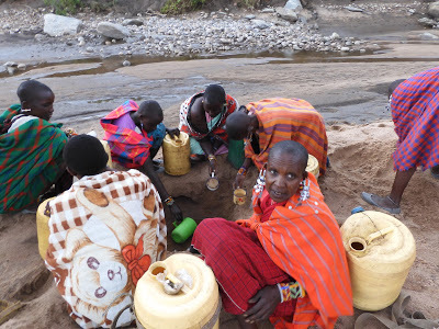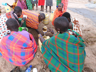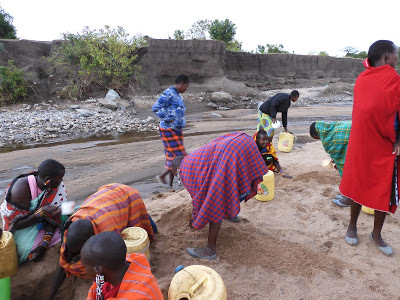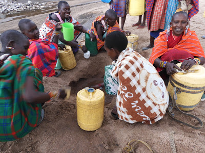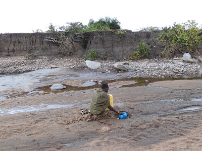Twice a day, the women dig holes in the mostly dried up river bed, wait for them to fill, then dip their cups into the fresh water, cupful by cupful, filling their jugs.