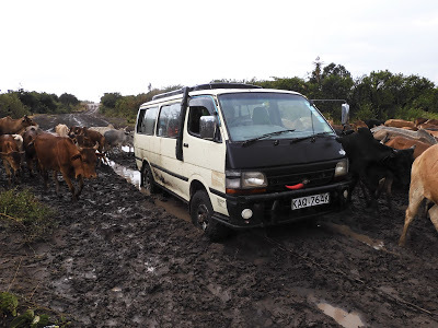 Dann, Bonny and the other two boys jumped out and admirably pushed and rocked the van for a long time, as herds of cattle, sheep and goats were herded passed us. Denise and I had no idea how we could possibly ever get out of the mire. As the rain continued to fall.