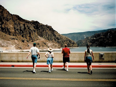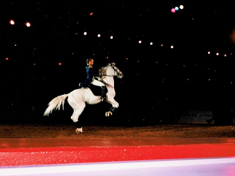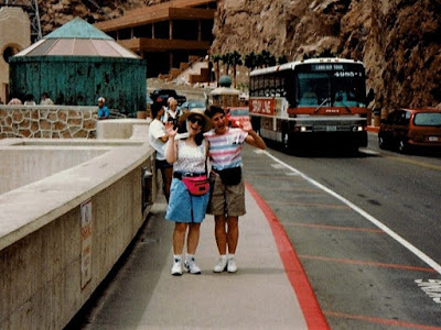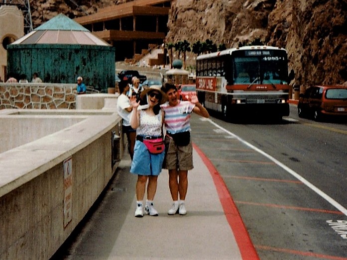 1997The most uncharacteristic thing that my sister Pat ever proposed was that we go to Las Vegas. She hated big cities, hated commercialism, hated crowds, was not fond of shopping or gambling or watching people do stupid things. Where did she get the idea that we should go to Las Vegas? Because she had heard that Las Vegas has fantastic and inexpensive buffets, and her husband Jeff lived for a good cheap buffet. So we booked flights for May 1997. My husband Himey had been to Vegas many times before I met him, and he would be our travel-guide. In addition to us two couples, Jeff’s daughter from his first marriage, Amy, came along. We rented a car one day and drove to Hoover Dam, because, well, everyone goes to see the Dam their first time to Las Vegas. One night we all took the bus down to Fremont Street for the light display in the gigantic neon-light canopy. Another night, we went to King Arthur’s Tournament, which involved watching the joust while eating Cornish hen, at the Excalibur. The next day, Pat and I watched the World-Famous Lipizzaner Stallions in the same arena. I think while we were there, Himey took Amy on some death-defying ride that scared her silly.