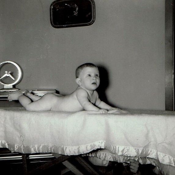 In November of 1959, four months old. Notice a creepy hand in the lower right hand corner? Looks like they are holding onto the blanket, but why?
