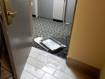 And then there was the next morning. As I was getting dressed, I heard a crash in the hallway. I could also hear kids laughing so I didn’t think much of it until I saw water streaming under our door and into our kitchen floor. Apparently, this pan full of water fell out of the ceiling. I know, what? But really, the hotel was an okay place to stay.