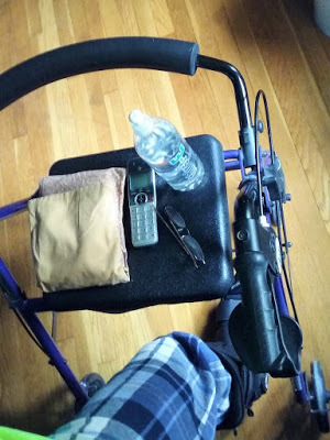 Which is where my mom’s walker comes in. Let me tell you, it was a huge blow to this fifty-something-year-old to be hobbling around my house pushing this thing. The only bonus is all the stuff I can carry in it. I didn’t get a picture of the storage hatch beneath the seat. I still need to load it up with treats though.