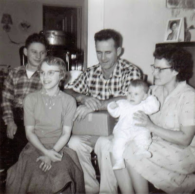 1968, finally a family picture of me (on the lower left), my sister Pat on the lower right, then Dad, Judy with her baby Paula, Tom and Mom