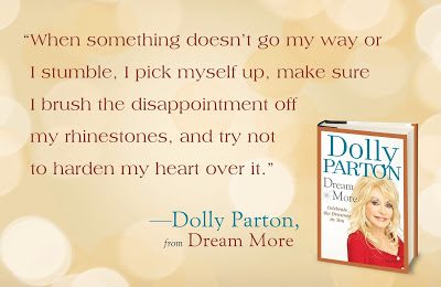 It's a small book meant to inspire and motivate and it's written by Dolly Parton. I've always loved Dolly. She's bigger than life with her big hair, bold makeup, and glitzy wardrobe. She's charismatic, down-to-earth, and incredibly talented. A singer and songwriter. An actress and founder of Dollywood and the Dollywood Foundation for the Imaginary Library. She's also, I learned after speed reading the preface of this book, a gifted writer with some valuable insight and advice. I only just started DREAM MORE--Celebrate the Dreamer in You and I am already charmed and inspired. Happening on this little gem at this particular time in my life was a blessing.