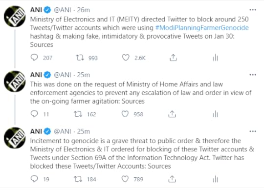 ** Caravan, Kisan Ekta Morcha and quite a few of the withheld accounts were restored at night, around 9pm. I don’t know if all the accounts were restored, but I’m guessing they were. No explanation was given about the restoration, which makes it obvious that this whole exercise had everything to do with harassment and intimidation; and nothing to do with maintaining “public order”.