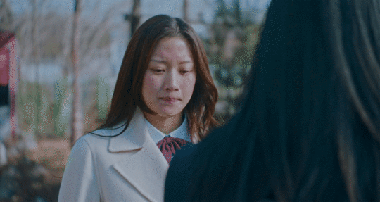 Su-Jin bumps into Su-Ho at the mall and she pretty much shows him her bruise, only to realise Su-Ho knows her father has been hitting her. She didn’t expect that he’d know it’s been going on for years. She lashes out at him (because he thinks he knows what’s going on with her but still hasn’t done anything concrete?): “You’re so annoying. You don’t know anything. But I’m always struggling to do better than you. I can’t take it anymore! It pisses me off! Everything pisses me off! It pisses me off that I’m always compared to you. I really don’t think I can do this anymore. Why do you have to go to the same school as me? Why don’t you transfer?” Second sign that she’s spiralling. Neither of them realise Ju-Gyeong has seen them hugging.