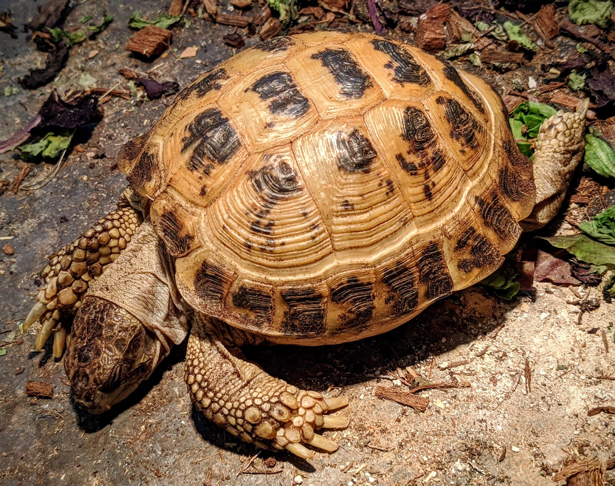 The tortoises I live with, in particular, an old Russian Tortoise, a rescue I call Chili (whose previous human had sadly named him Smirnoff), inspire thoughts about choice in a different light than is cast by the relationship I have, and have had, with dogs. Chili lived a small life in a small Tupperware container prior to coming to live with us in New Hampshire; despite moving into a bigger enclosure with better environmental conditions and food than he was used to in his previous life, he was grumpy and on a hunger strike for the first month and a half we lived together. Tortoises don’t like change, so he chose not to eat for six weeks, which didn’t hurt me, although it worried me plenty. After offering, and then throwing away perfectly good food for forty days and forty nights, one day, same food, he began to eat. Another aspect of his early days with me was hiding, burying himself; apparently, that’s a common tortoise thing when they’re young or scared or in new surroundings. After a few months, he grew sufficiently comfortable with my comings and goings and offerings and not eating him that he took to napping all over the place, wherever and whenever the mood took him. This suggests a trust that I won’t attack him in his sleep, but he still doesn’t like me. My other tortoises are curious about me, watching me while I write this essay, or following my movements around the office when caring for them or bringing food, and will come over for scratches on their heads or shells; Chili not only will not allow scratches, but if my hand stays in his enclosure and in one place for long enough, he’ll move in and bite me (I’ve tested it, with him and the others, he’s the sole biter among my five torts). The fact that he both trusts and dislikes me makes our troubled relationship interesting, and I will admit to spending extra time and effort trying to win him over (to date with a marked lack of success).