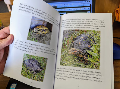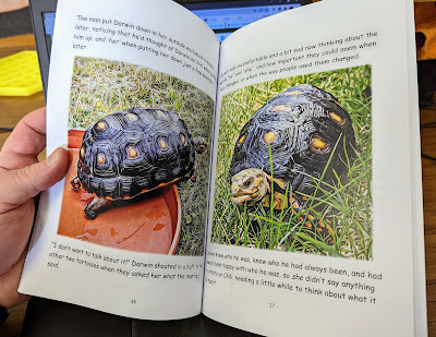 I've been noodling with writing a children's book about my tortoises for a while, trying to find the right story and words and pictures to do such a book, and the tortoises, justice. I finished a draft of the book, Chili, the Grumpy Tortoise , today, and ordered a copy so that I can see how the artwork translates... I used my own photos almost entirely, running them through a "photo to painting" app to dial down the photo-realistic feel of the pictures.