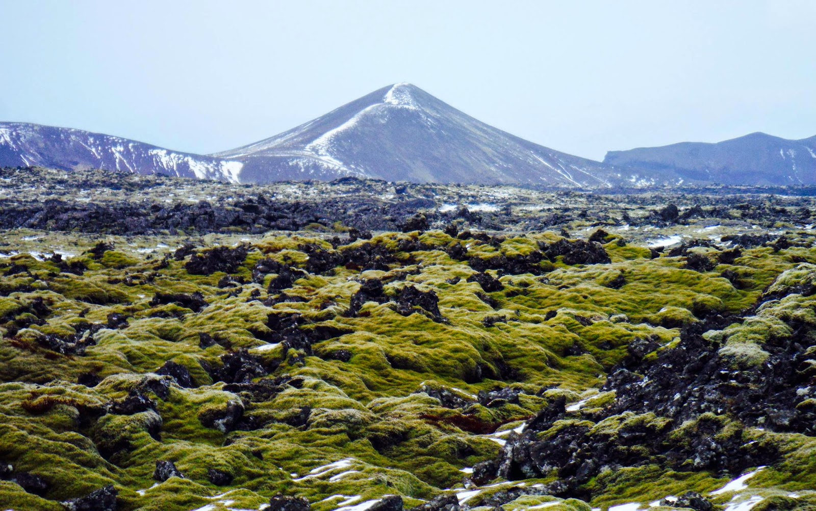 A stunning volcano and field of volcanic rocks.