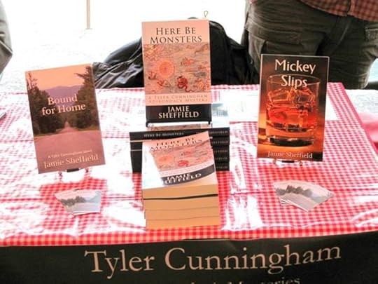 We got down to the big tent set up behind the main building of Hoss's around 5:45, and set up my space on the table, with copies of "Here Be Monsters" from Hoss's shelves, and some info-cards about "Mickey Slips" and "Bound for Home" flanking the print books.