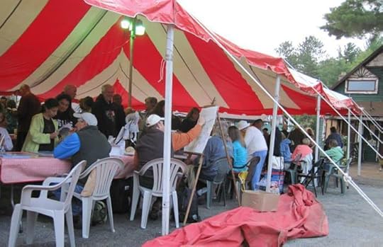 {for those interested, my name is second from the top in the column to the right}Author's night is an event that Hoss's hosts to bring together writers whose subject matter is the Adirondacks. We initially got together for a nice cookout dinner at the Long Lake Pavilion, which is up the side of a hill over the Hamlet of Long Lake, offering a pretty view of this lovely little town. When Gail and I arrived, there was a pair of deer watching the setup with interest, but by the time all 82 Adirondack Authors (and their minions) had arrived, the deer had melted back into the woods. During and after dinner, writers mixed and mingled a bit, talking about...books (and writing, and reading).