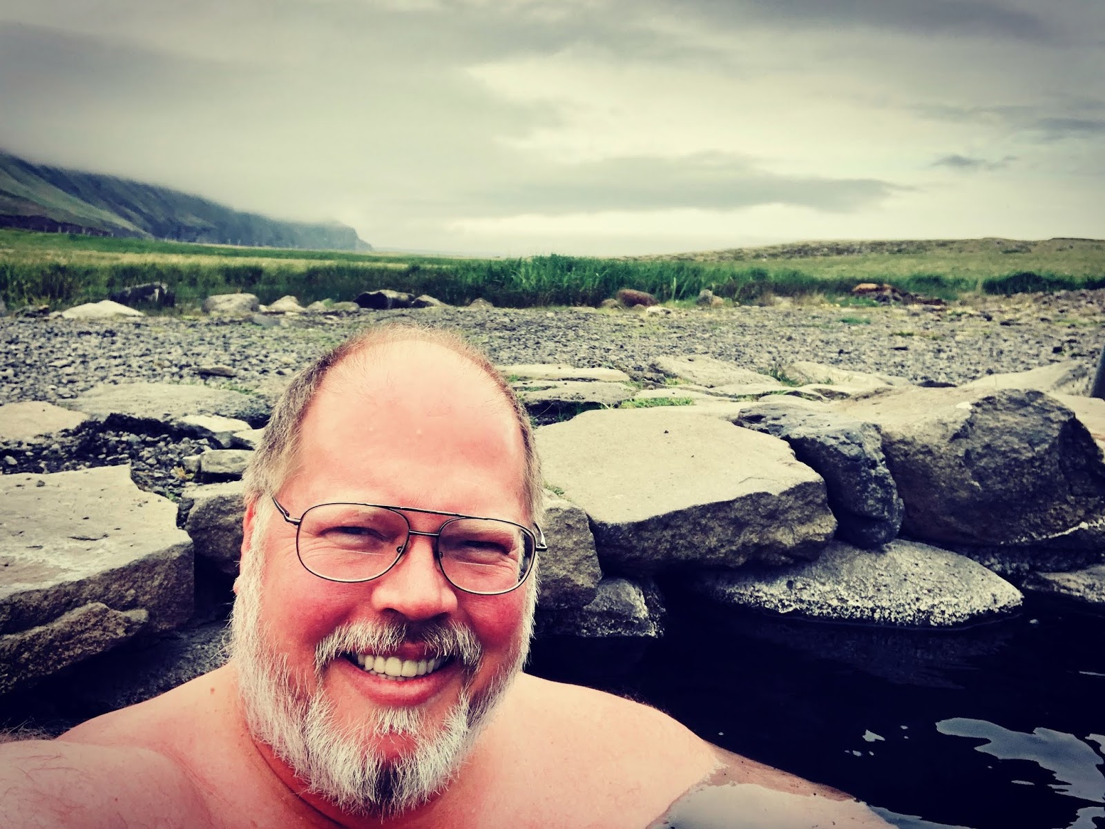 The picture above is of Grettislaug, a hot pot out in the wild, at the end of a rugged peninsula pointing at the Arctic ... this pool, unlike the tame ones in towns and villages across Iceland, had a healthy colony of algae growing on the bottom and a few spots in the floor where superheated water that would have raised blisters in a few seconds if not avoided kept it full, and me warm on a cold and breezy day by the Greenland Sea.