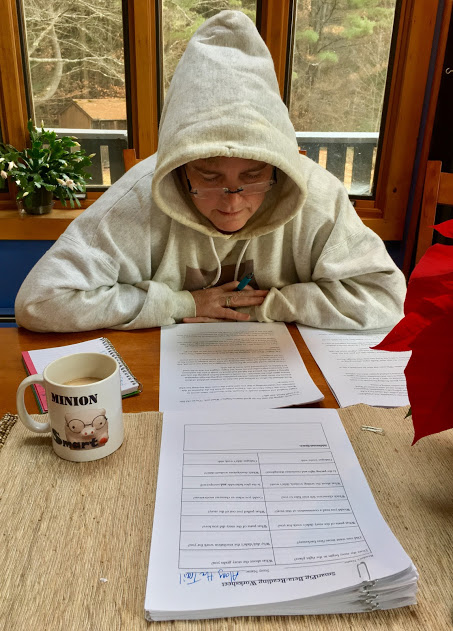 My wife Gail is hard at work reading her way through a pile of stories, and organizing them into multiple piles after a mix of big picture and small grammar talk about each one ... it's a lovely way to wile away a Sunday morning.