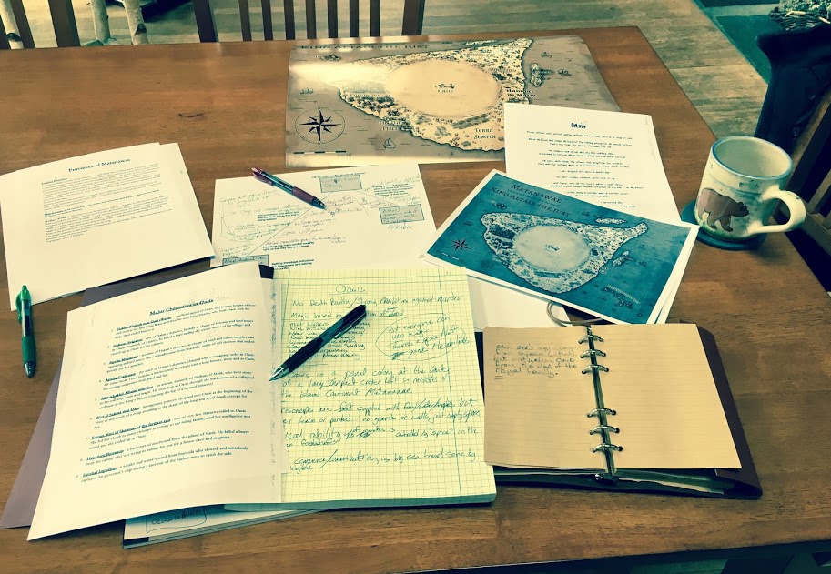 There's a map of the world (more than one, actually), and some geo-biographies about all of the major and minor provinces. I know the twenty first and second tier characters pretty well. The arc of the story is planned out in some detail (I like to signpost major points, and then let the path from point to point write itself with the help of my fingers and the lunatics living in the back of my skull). I have enough coffee on-deck and ready to go to get the Mormon Tabernacle Choir jittery until the end of winter.