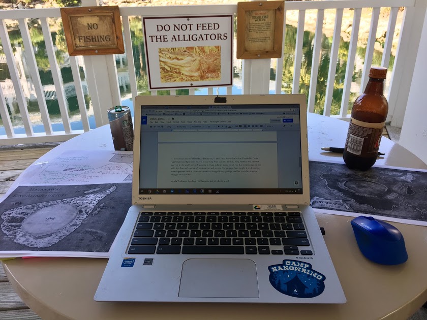 Yesterday was lovely from sun-up to sun-down, and I spent most of it hiding from the sun like it wanted to kill me (which it does) in a gazebo, typing and telling myself a new story, about a new world. I'm working on a Fantasy Novel titled (at the moment) "Oasis", and having fun exploring the world and characters and the trouble they get themselves into, and hopefully out of ... you can see two maps of the primary contininent of the world bracketing my Chromebook.
