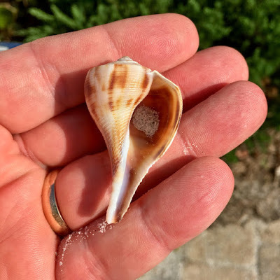 After my final chunk of writing for the day I took a long swim and stretch in the pool and then walked the pretty beach for a bit, finding this little shell on my way back, in a pile of discards, which for some reason made me feel badly for it.
