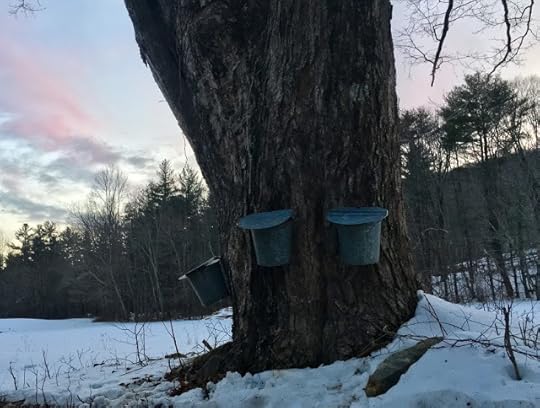 The dogs and I watched the old farmer drill holes, tap spiles, then hang buckets this afternoon.
