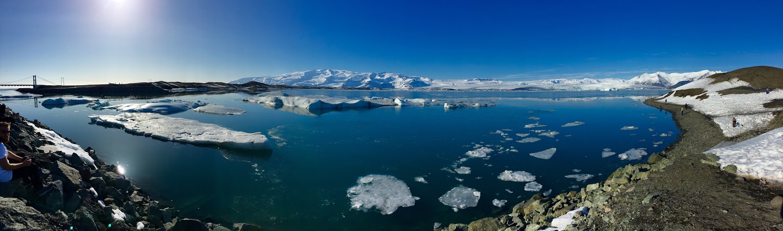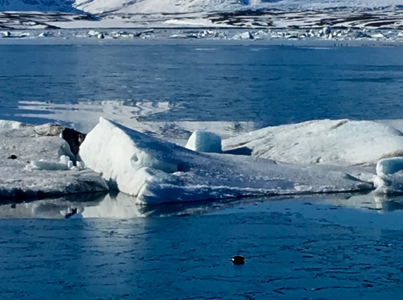 We walked out and under the bridge, away from the lagoon to the ocean, where the icebergs go to die. They reach the open ocean and are mostly thrown back to break up on the shore ... white chunks on a black beach. Ben and I had been watching "Fortitude" on my Kindle the night before, and spent some time looking over out shoulders for hungry polar bears ... we didn't see any.
