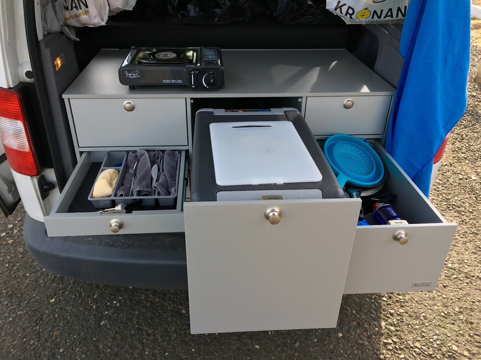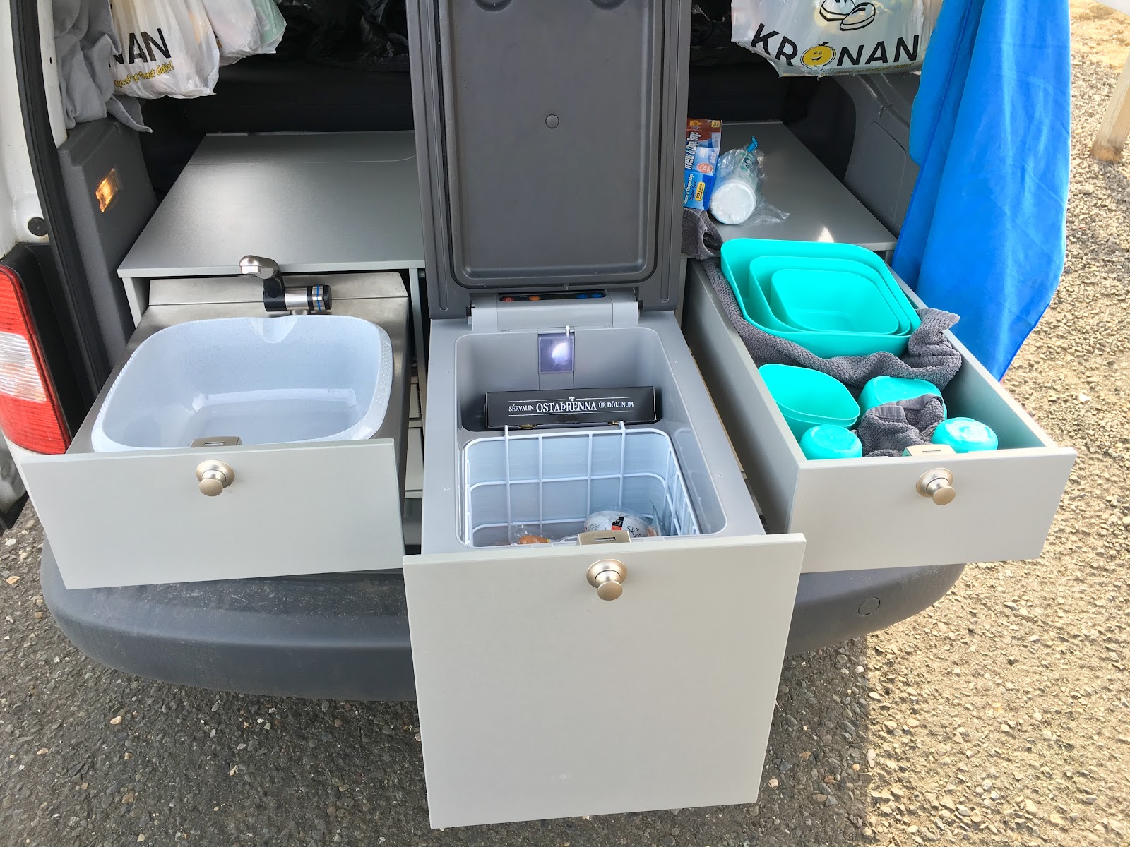 The drawers at the back of the campervan open up to reveal the kitchen: fridge, sink, and plates/bowls/cups.