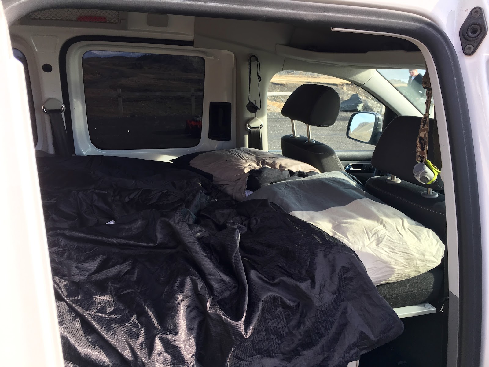 We lived and explored in a VW Caddy, which had a put-away-able bed, which we never really put away ... we left it mostly assembled for simplicity's sake, and put our luggage on top of it during the day while driving. This worked for us as there were only the two of us, and we sat in the front all of the time. It was about the size of a full/double bed, and we kept bags of produce/bread/drinks at one end, which our feet shared with the bags every night.