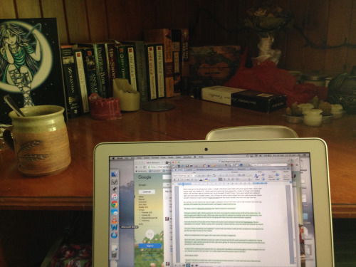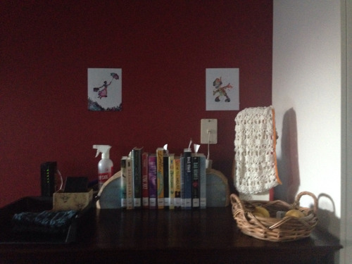 I’ve been whining and bemoaning that the downstairs writing area I set up for myself last year, and hasn’t been even after I cleaned and extended the area to the top of our alcohol cabinet, which now boasts a shelf of my library book loans between agate bookends.