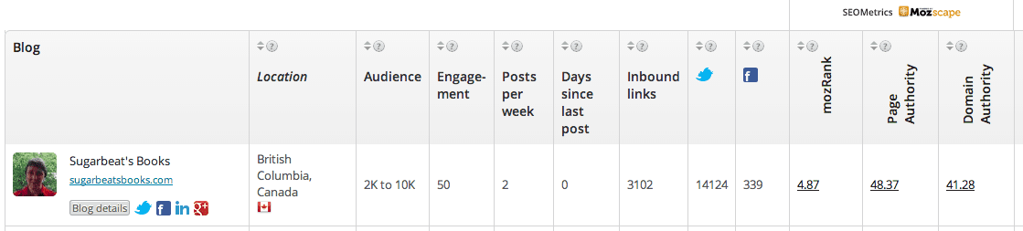 Inkybee finds relevant bloggers using sophisticated keyword and tag-based searches. It then tells you which blogs are the most important by displaying a selection of key metrics, for instance: