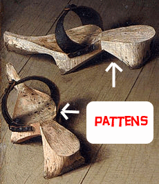 Both men and women wore pattens, which were strap-on clogs that went over their satin slippers. These wooden platforms would help raise them up out of the manure and mud (and the contents of chamber pots being thrown out of windows!) that covered the streets of the cities and villages.