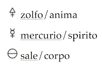 Secondo Paracelso, la conoscenzadella Tria Prima era cruciale per l'arte dell'alchimia, poiché ogni sostanzapoteva essere scomposta e ricomposta in base alle proporzioni dei tre principi.In questo modo, l'alchimista poteva trasformare la materia grezza in oro, maanche curare malattie e raggiungere la perfezione spirituale. Ecco, quindi, i simboli dei tre elementi.