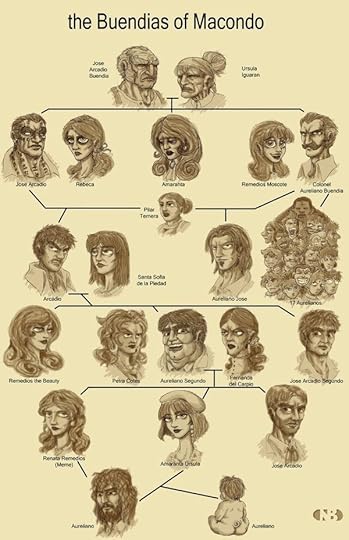 Árvore genealógica da família BuendíaAinda assim, perdoem-me o preguiçoso trocadilho, encho a pança com tanto riso com estas descabidas aventuras do engenhoso e desdentado fidalgo que anda por aí convencido da veracidade histórica dos romances de cavalaria, confundindo gigantes com moinhos, tomando castelos por vendas, e tratando donzelas como rameiras, entre outras confusões não menos paródicas.Se alguma editora se lembrar de dar às estantes das livrarias nova edição com digna tradução da linhagem do nosso nobre andante cavaleiro, seu rocim Rocinante, e do seu esguio escudeiro, que se lembre também de lhe dar o papel, o tamanho, e o tipo de letra adequado.
