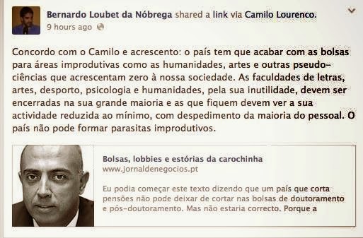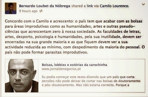 Bernardo Loubet da Nóbrega, na província. Bernardo Loubet da Nóbrega, uma espécie de Isabel Jonet com dois tomatitos entre as pernas, apenas um pouco mais estúpido, narrow-minded (porque esta gente gosta muuiiito de inglês - do mesmo modo que os seus pais e avós adoooravam francês!) - não, não traduzam como pobre de espírito - tacanho soa mais provinciano - dizia, apenas um pouco mais idiota - ou labrego*, se quiserem - que o Camilo Lourenço - mas muito mais desbragado - que é palavra para ser um tanto ou quanto arcaica - aqui no sentido de desbocado - que tipos destes não têm categoria para indecorosos, ou libertinos - quanto muito são dissolutos - às escondidas! - e com o cílio nas costas... não seria melhor dar-lhes apenas uma refeição por dia? - e porquê irem à escola, menino? Tanta bala desperdiçada no mundo, meu Deus! Ai a ironia...